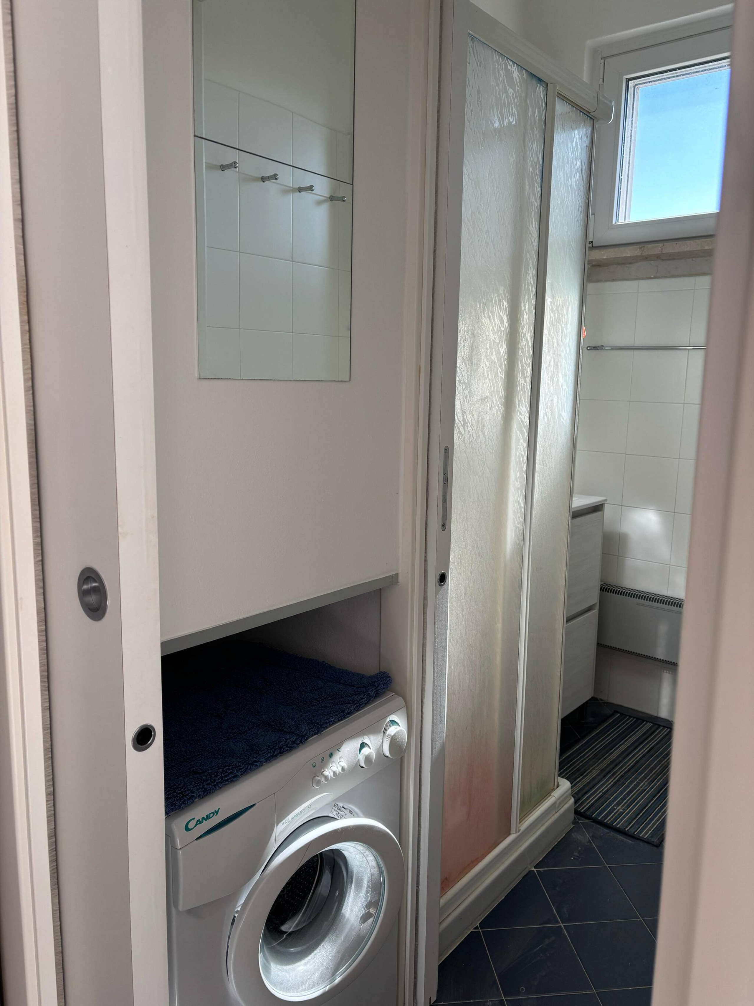 Un bagno, dotato di doccia, lavello, wc e lavatrice.