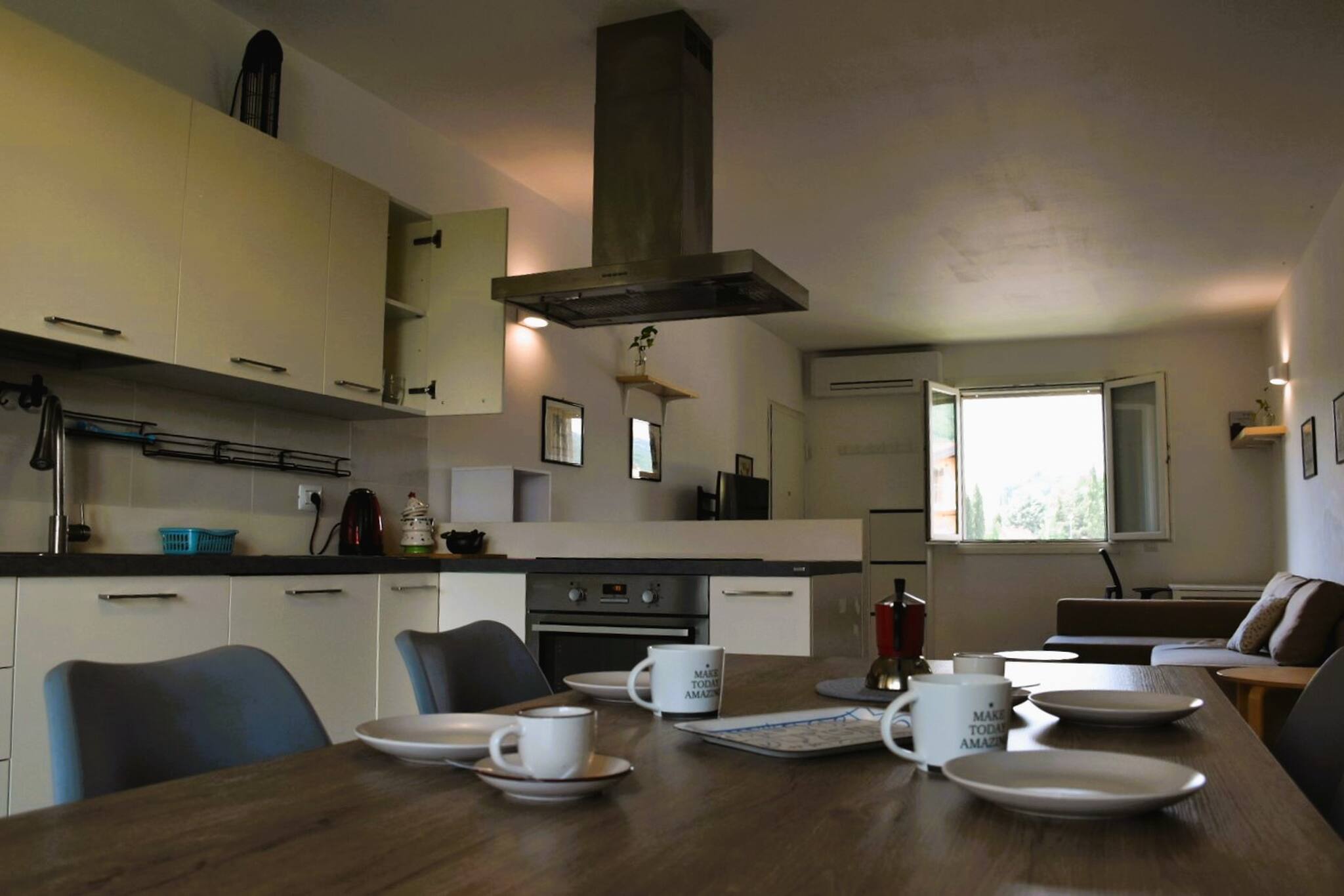 La cucina open space è completamente attrezzata e rappresenta il cuore dell'appartamento. Dotata di elettrodomestici moderni come frigorifero, lavastoviglie, forno, macchina per il caffè, microonde, tostapane e bollitore, permette di preparare pasti gustosi e veloci. Sono inoltre disponibili stoviglie e utensili da cucina per rendere l'esperienza culinaria più agevole.