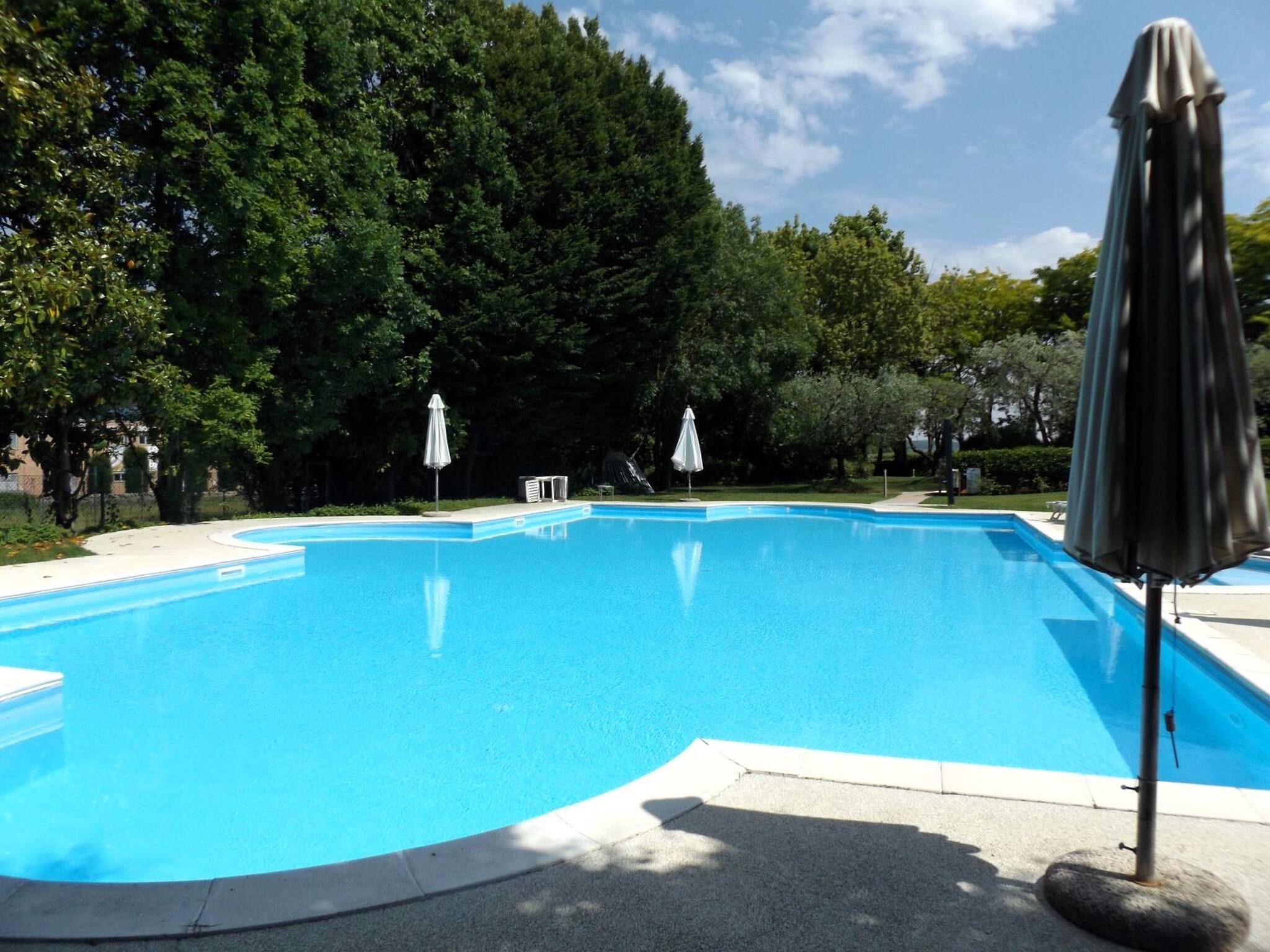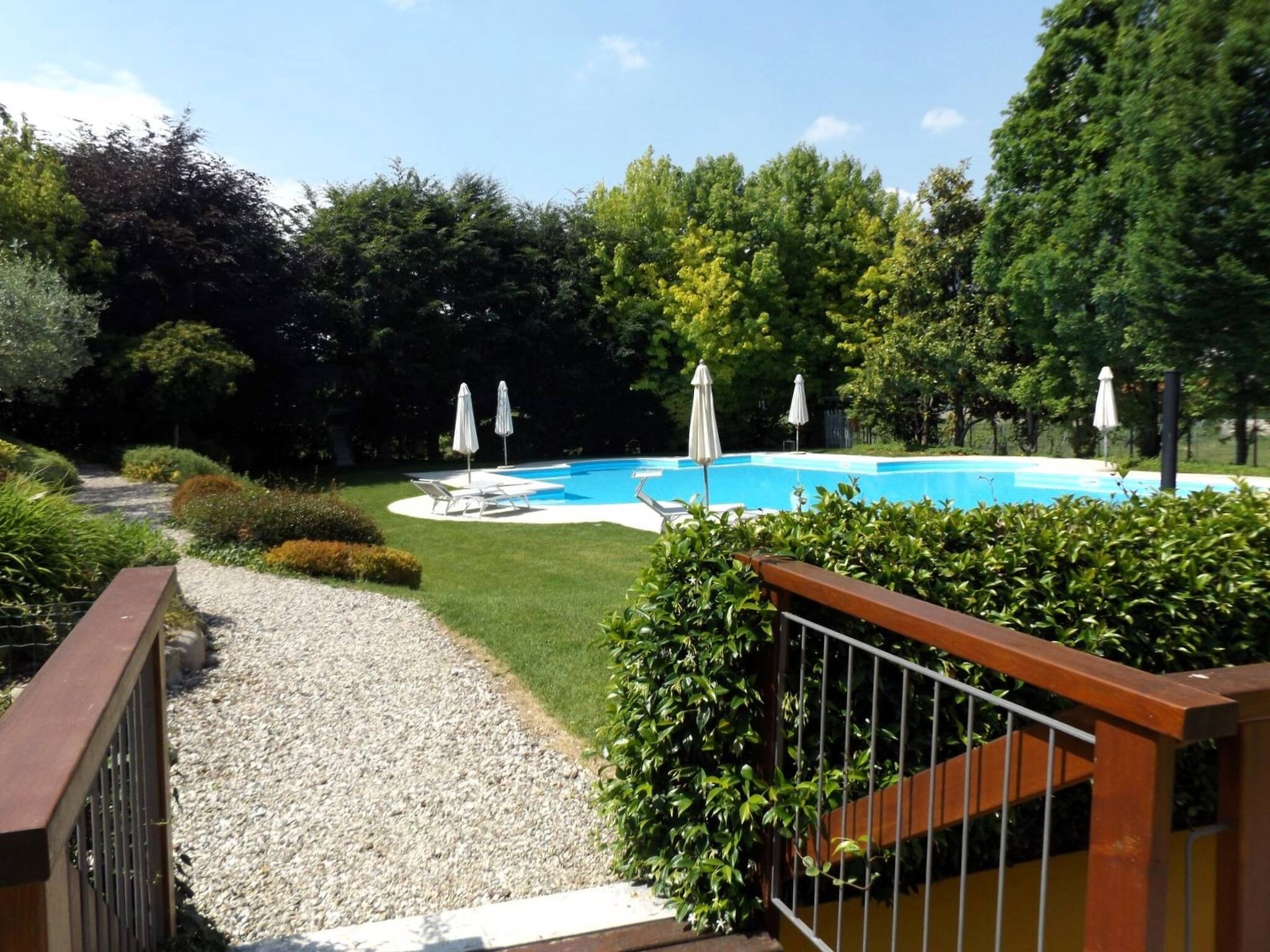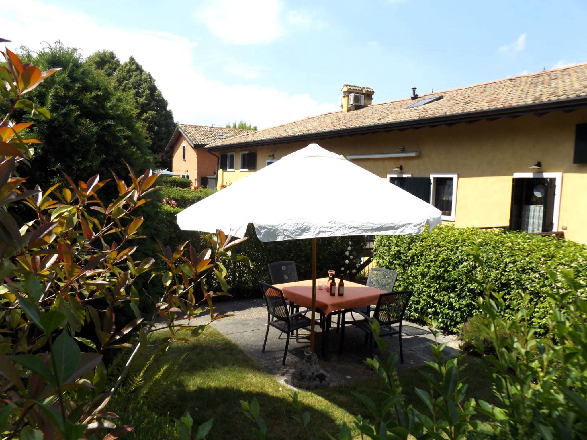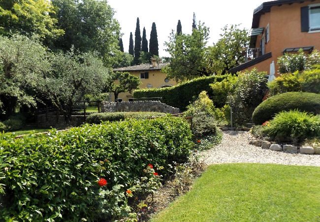 In un elegante storico casale completamente ristrutturato, con un rigoglioso parco di mq. 6000, in cui si trova un’ampia piscina (ca. m. 18×10) , un campo da tennis, palestra e sauna, si trova l’appartamento bilocale soppalcato, in posizione tranquilla e con proprio piccolo giardino privato, dove trovano posto un tavolo, sedie ed ombrellone. A pochi metri si può accedere direttamente, tramite un piccolo cancello, alla pista ciclabile e a tantissime passeggiate, molte di cui panoramiche che portano fino al lago. L’alloggio si trova al piano terra con ingresso indipendente; giardinetto privato con tavolo, ombrellone e sedie. Per accedere all’appartamento si attraversa un piccolo ponte in legno. Ingresso e cucina open plan (piano cottura in marmo rosso Verona. 4 fuochi, forno elettrico, microonde, frigo-freezer, lavastoviglie), zona giorno con tavolo e sedie, tv e accesso diretto al giardino; camera con letto francese 140 cm, bagno con doccia e lavabiancheria; si devono salire 13 gradini per il soppalco sovrastante il soggiorno (pavimento in legno), dove si trova la seconda camera da letto matrimoniale con abbaino/velux e piccole finestre; bagno con doccia finestrato. Climatizzazione. Garage privato. Animali accettati; a disposizione di ogni appartamento 2 sdraio e ombrelloni condominiali in piscina.
