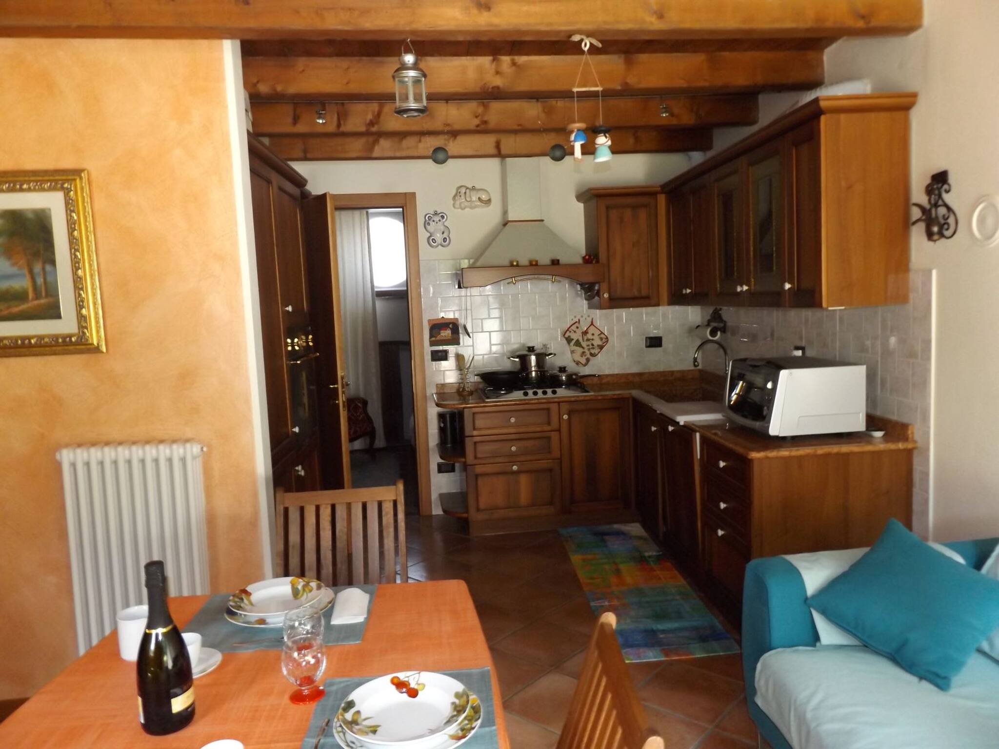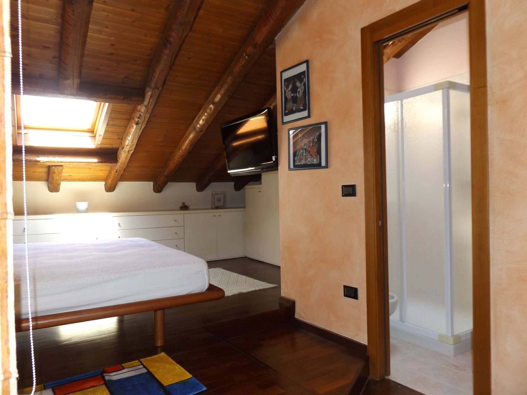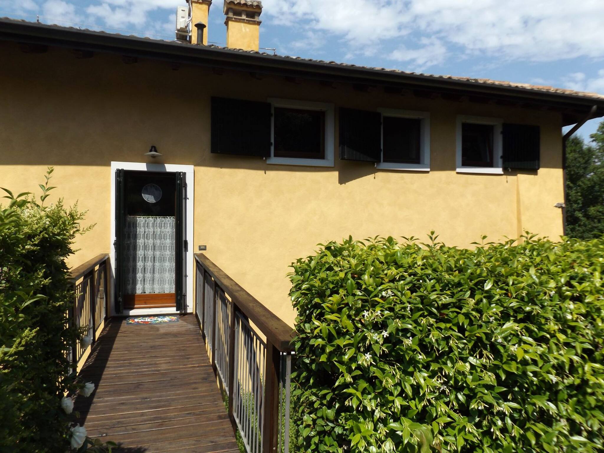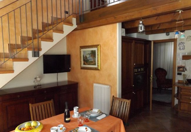 In un elegante storico casale completamente ristrutturato, con un rigoglioso parco di mq. 6000, in cui si trova un’ampia piscina (ca. m. 18×10) , un campo da tennis, palestra e sauna, si trova l’appartamento bilocale soppalcato, in posizione tranquilla e con proprio piccolo giardino privato, dove trovano posto un tavolo, sedie ed ombrellone. A pochi metri si può accedere direttamente, tramite un piccolo cancello, alla pista ciclabile e a tantissime passeggiate, molte di cui panoramiche che portano fino al lago. L’alloggio si trova al piano terra con ingresso indipendente; giardinetto privato con tavolo, ombrellone e sedie. Per accedere all’appartamento si attraversa un piccolo ponte in legno. Ingresso e cucina open plan (piano cottura in marmo rosso Verona. 4 fuochi, forno elettrico, microonde, frigo-freezer, lavastoviglie), zona giorno con tavolo e sedie, tv e accesso diretto al giardino; camera con letto francese 140 cm, bagno con doccia e lavabiancheria; si devono salire 13 gradini per il soppalco sovrastante il soggiorno (pavimento in legno), dove si trova la seconda camera da letto matrimoniale con abbaino/velux e piccole finestre; bagno con doccia finestrato. Climatizzazione. Garage privato. Animali accettati; a disposizione di ogni appartamento 2 sdraio e ombrelloni condominiali in piscina.