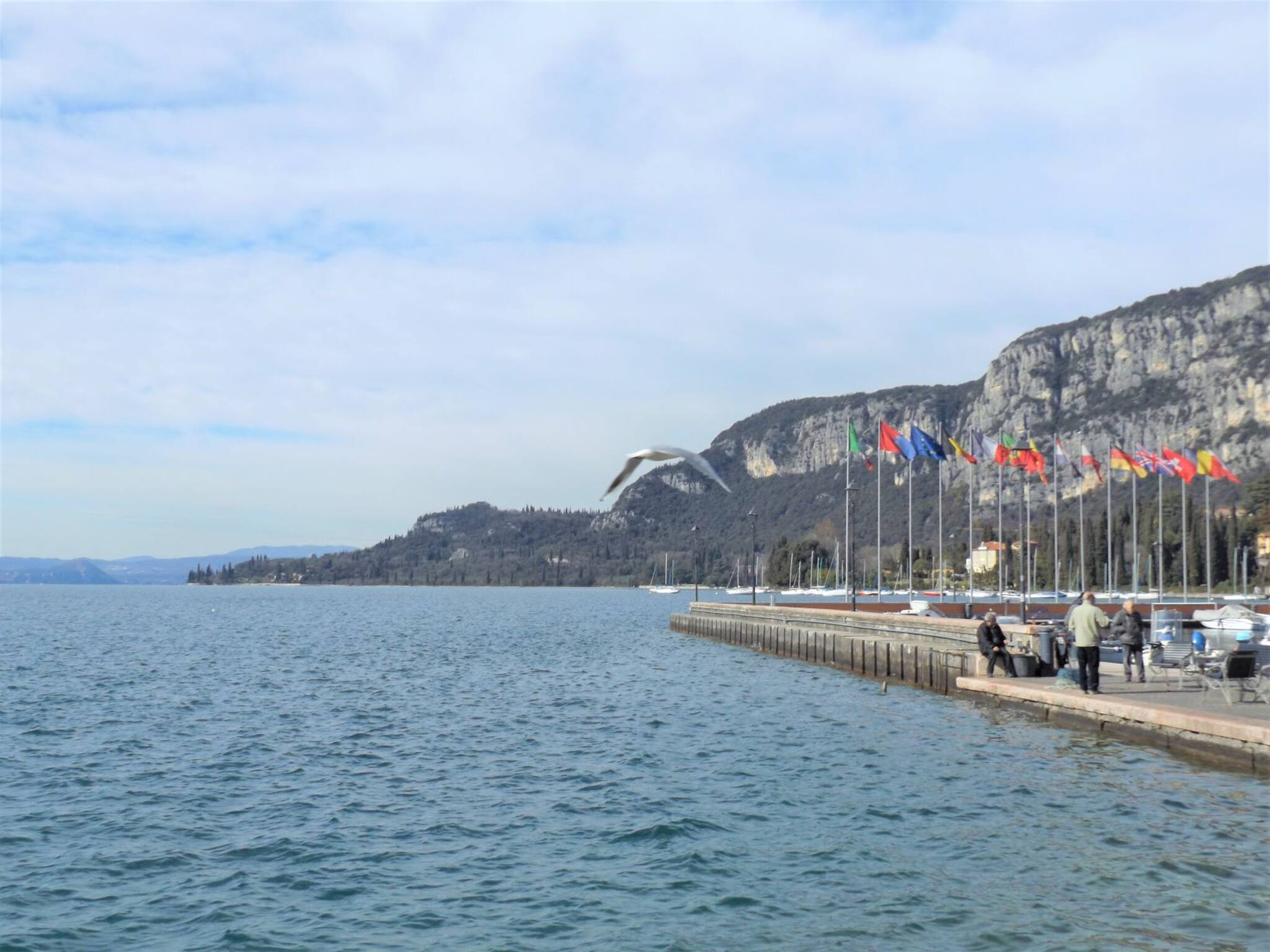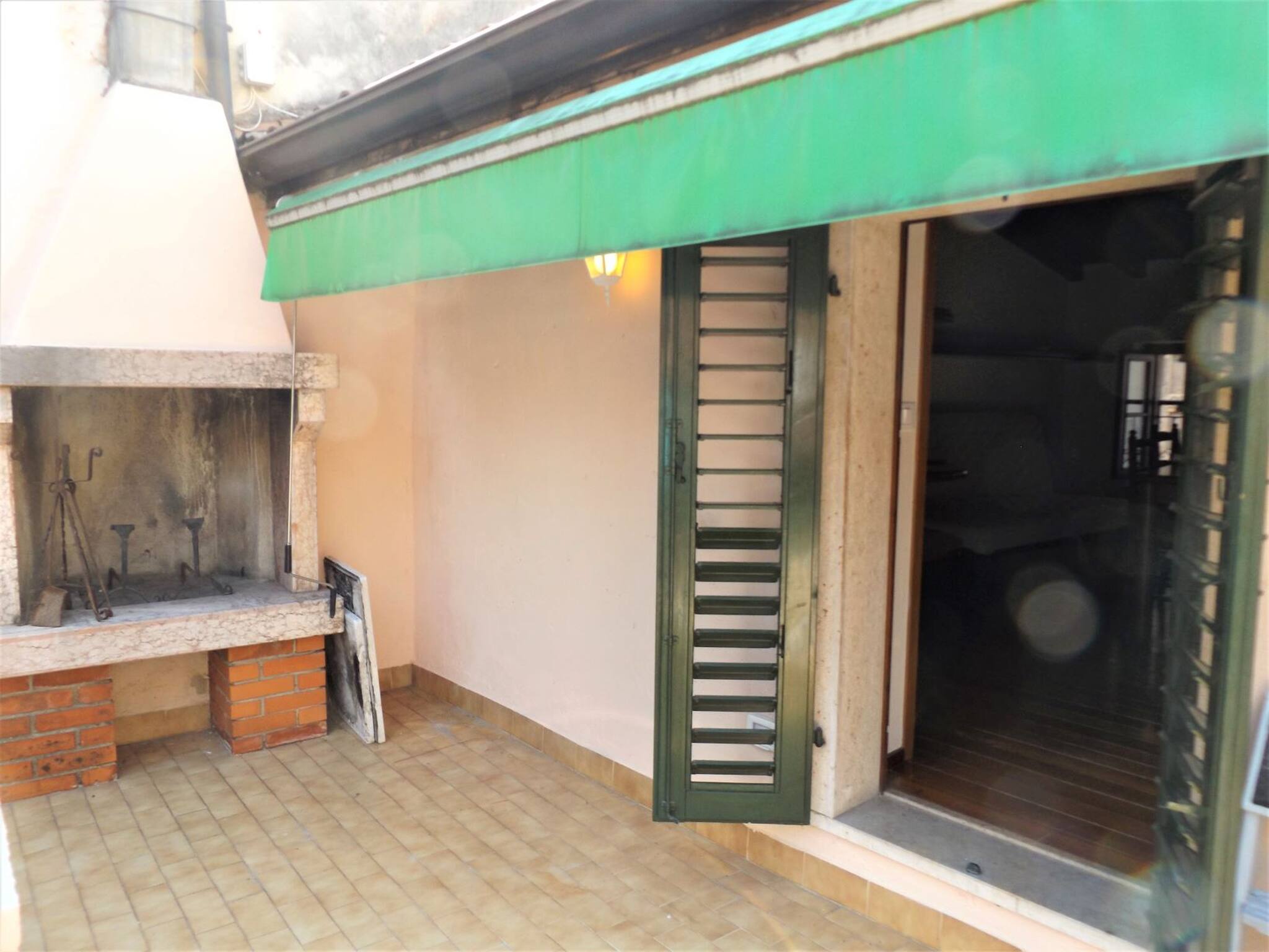 Dal livello stradale si salgono 18 gradini per il primo piano; aperta la porta blindata, si accede al soggiorno con angolo cucina (piano induzione, forno con microonde integrato, frigo con cella freezer, lavastoviglie), tavolo con 4 sedie, tv (tv-sat con decoder); divano letto matrimoniale; terrazzo ca. m 3 x 2,5 con bella vista della Rocca di Garda, tenda da sole elettrica riavvolgibile automatica, tavolo da esterno, sedie e sdraio.