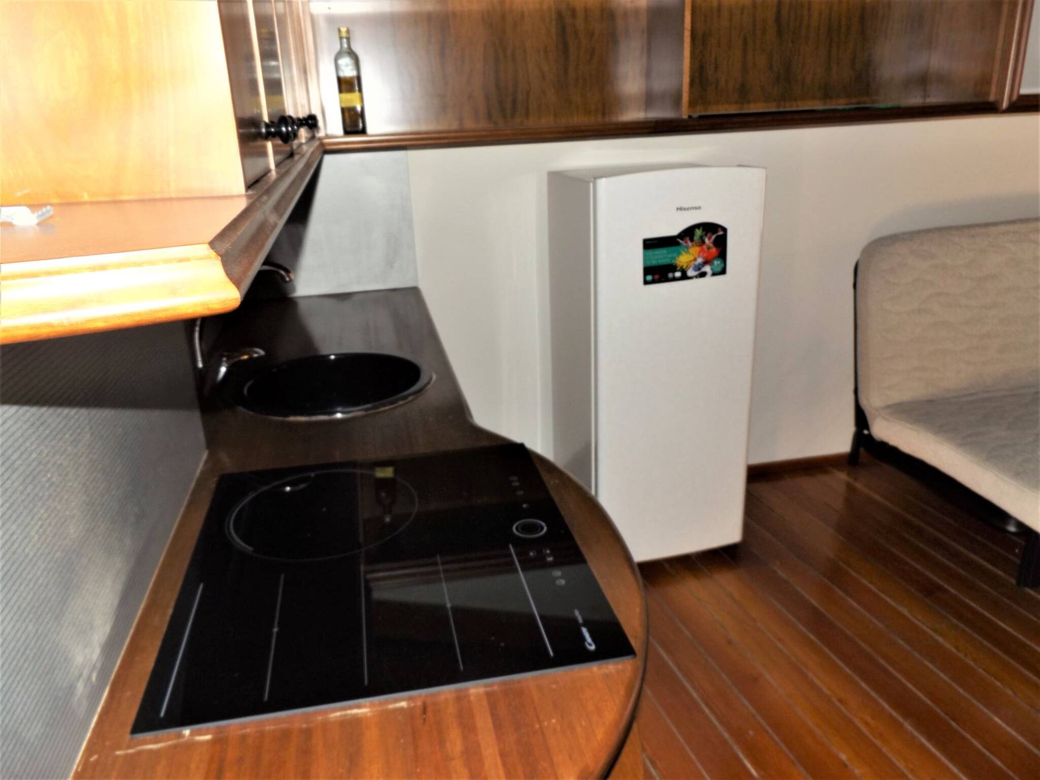 Per accedere alla zona notte si percorre un breve corridoio, dove si trova a una camera singola, la camera matrimoniale con armadio, il bagno con doccia (boiler acqua calda 50 litri).