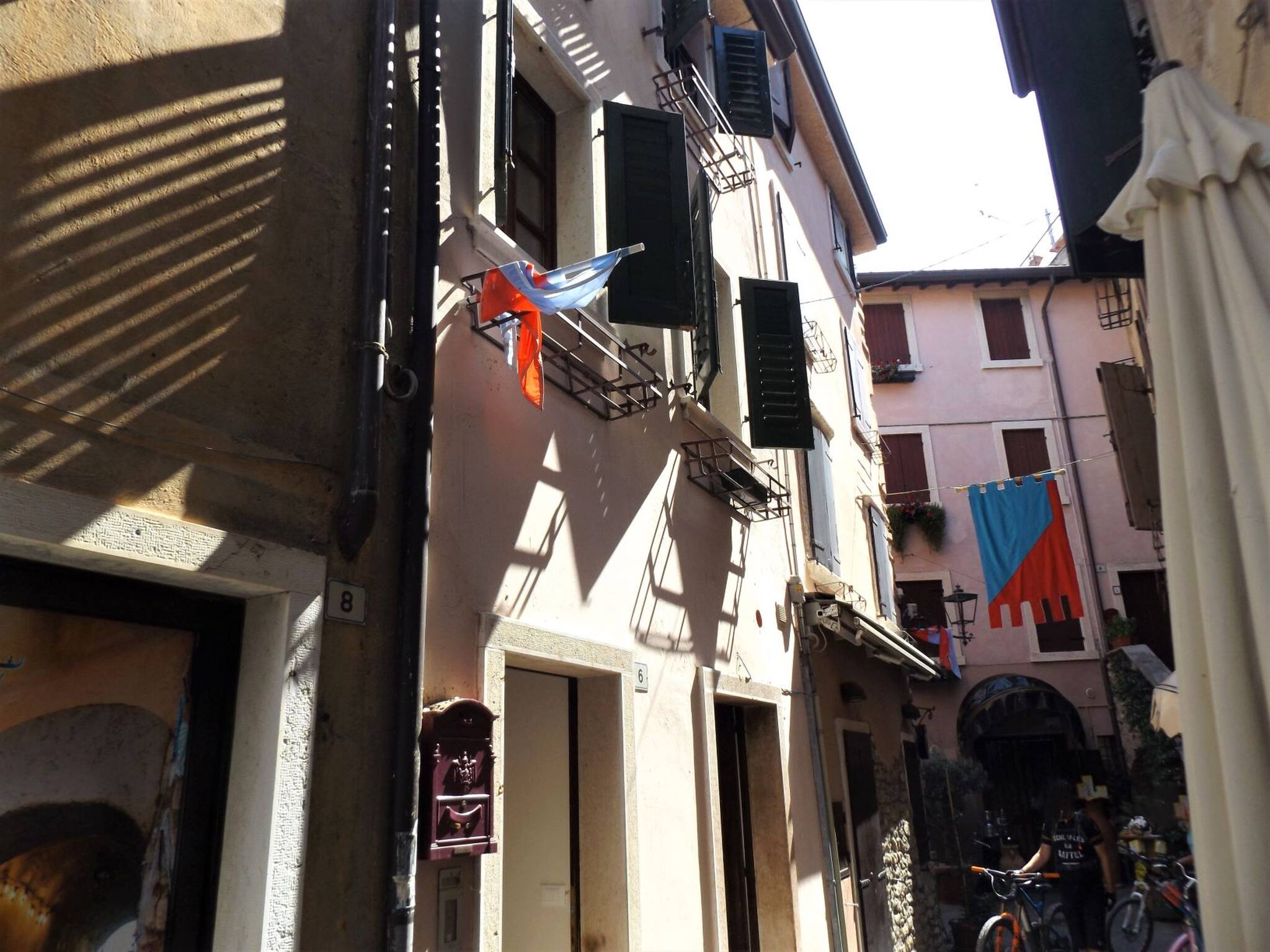 A pochi passi dal lago e nel pieno centro storico di Garda, la caratteristica “Casa Catullo” si sviluppa su tre livelli, ristrutturati e arredati recentemente. La casa si affaccia su due lati: da una parte il vicolo, da cui si entra tramite una porta di legno schermata da una tenda ricamata; dall’ altro lato l’ interno del paese, con le sue case colorate, i balconi, le terrazze e i tetti. I tre livelli sono connessi da una bella scala di legno. Al pian terreno c’ è l’ ingresso e lo spazio per lasciare le biciclette all’ interno della casa, in sicurezza. Al primo piano c’ è una camera da letto matrimoniale, una camera con letto a castello e un bagno con doccia. Al secondo piano c’ è la zona giorno, con tavolo da pranzo, divano letto singolo, televisione e angolo cucina, completamente attrezzato (frigo-freezer, piano cottura elettrico, forno a microonde): l’ ultimo piano si affaccia su un terrazzo esclusivo che domina il centro storico di Garda, attrezzato con tavolo e sedie da esterno, tenda da sole e un bellissimo camino dove cucinare ! A pochi passi ristoranti e locali di ogni genere, il lungolago e le belle spiagge del paese che da il nome al lago.
