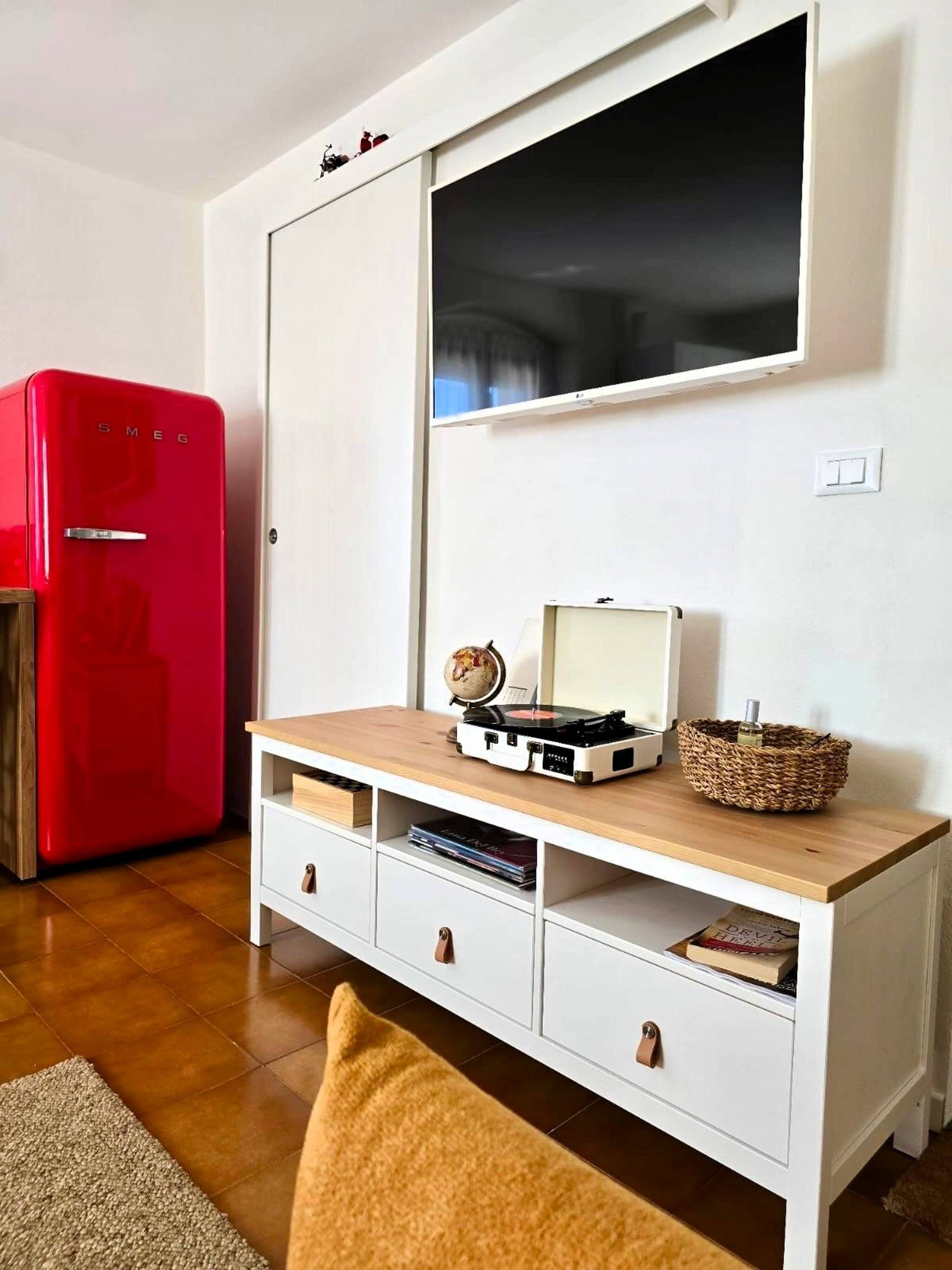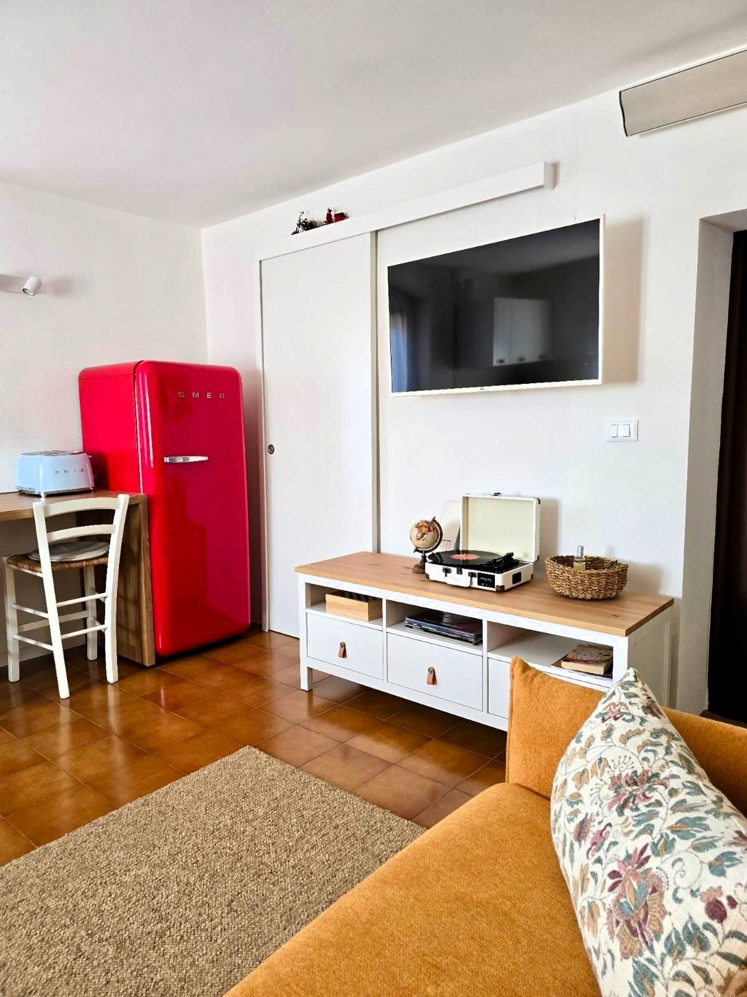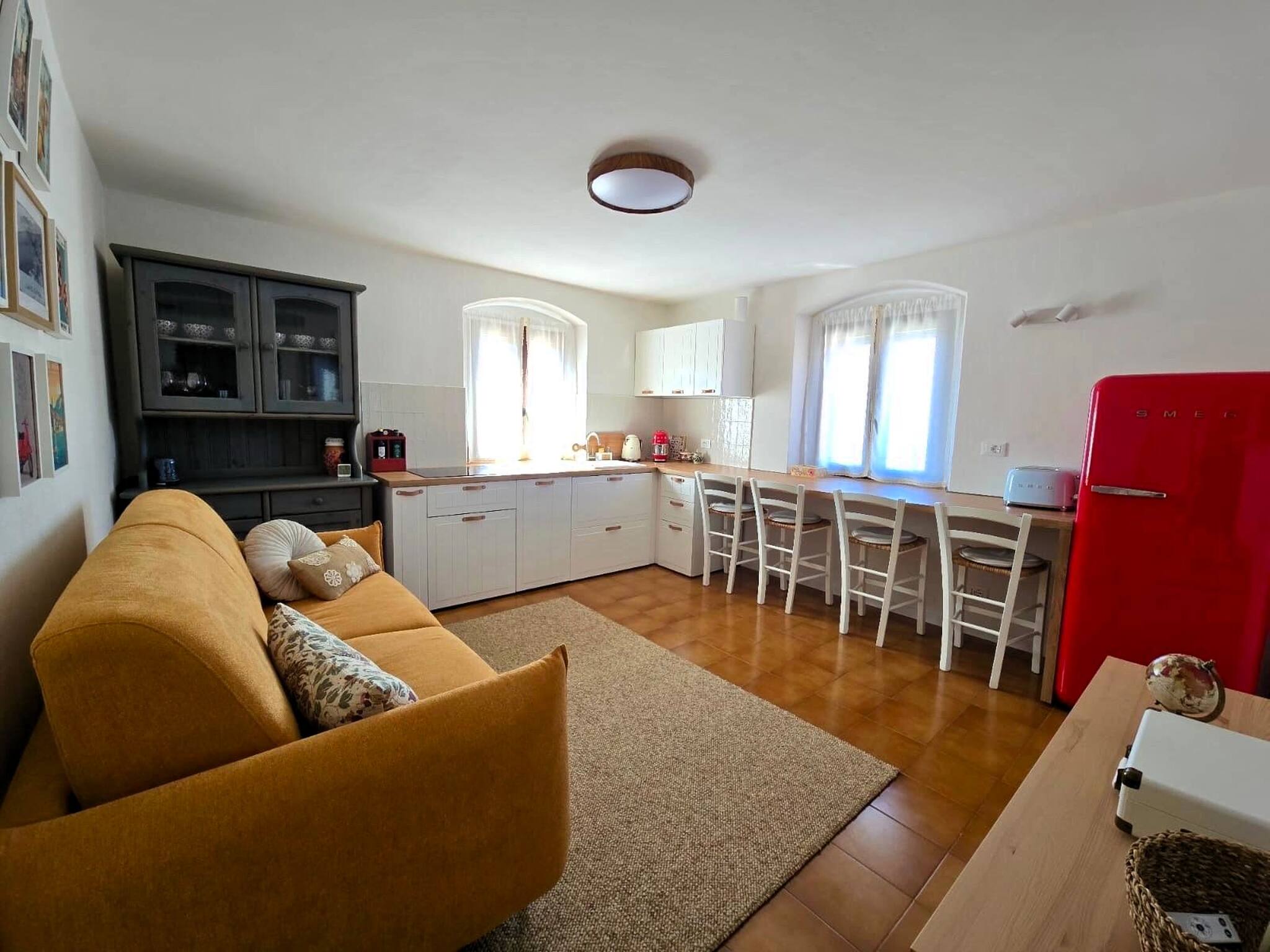 L’appartamento è composto da una luminosa zona giorno con cucina attrezzata (piano cottura a induzione, lavello, lavastoviglie, frigorifero), divano letto, TV e bancone con sgabelli per i pasti. La camera da letto offre un letto matrimoniale e un pratico letto a castello. Il bagno, finestrato, è dotato di doccia.