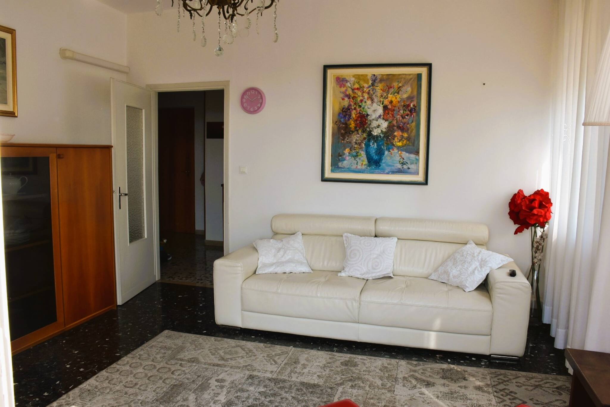 Nur wenige hundert Meter vom historischen Zentrum von Garda entfernt, ist Casa Leopardi eine Wohnung von etwa 100 qm in einem Zweifamilienhaus: gelegen im 2. Stock (38 Stufen mit Treppenlift für Behinderte, falls erforderlich). Sehr geräumig und hell, die Wohnung ist mit Doppelverglasung und Fliesenboden ausgestattet. Eingang mit Durchgang, Wohnzimmer mit Sofa, Sessel, digitalem terrestrischem Fernsehen, Zugang zur L-förmigen Terrasse, ausgestattet mit elektrischen Markisen und teilweisem Blick auf die Rocca di Garda und den See. Wohnküche mit separater Kochzone (4 Gasherde, Ofen, Kühl-/Gefrierschrank + zusätzlicher separater Gefrierschrank, Mikrowelle, Doppelspüle), ausziehbarer Tisch und digitalem terrestrischem Fernsehen. Schlafbereich: Waschmaschine in verstecktem Schrank im Flur, Elternschlafzimmer mit digitalem terrestrischem Fernsehen (Blick auf Hügel), Zimmer mit Doppelbett mit teilweisem Seeblick. Badezimmer mit Dusche. Safe. Klimaanlage mit Split im Eingang und im Schlafbereich. Im Treppenhaus können Fahrräder abgestellt werden.