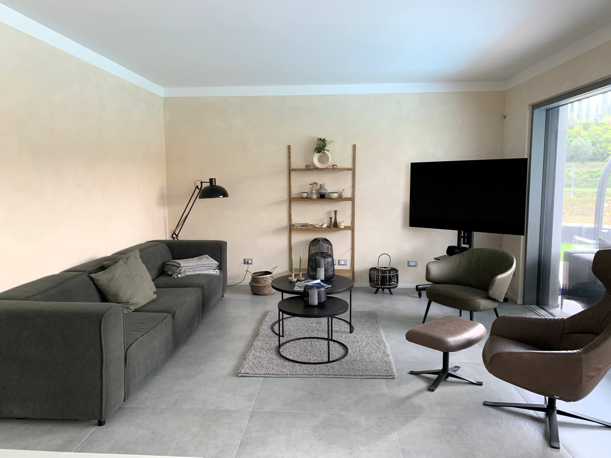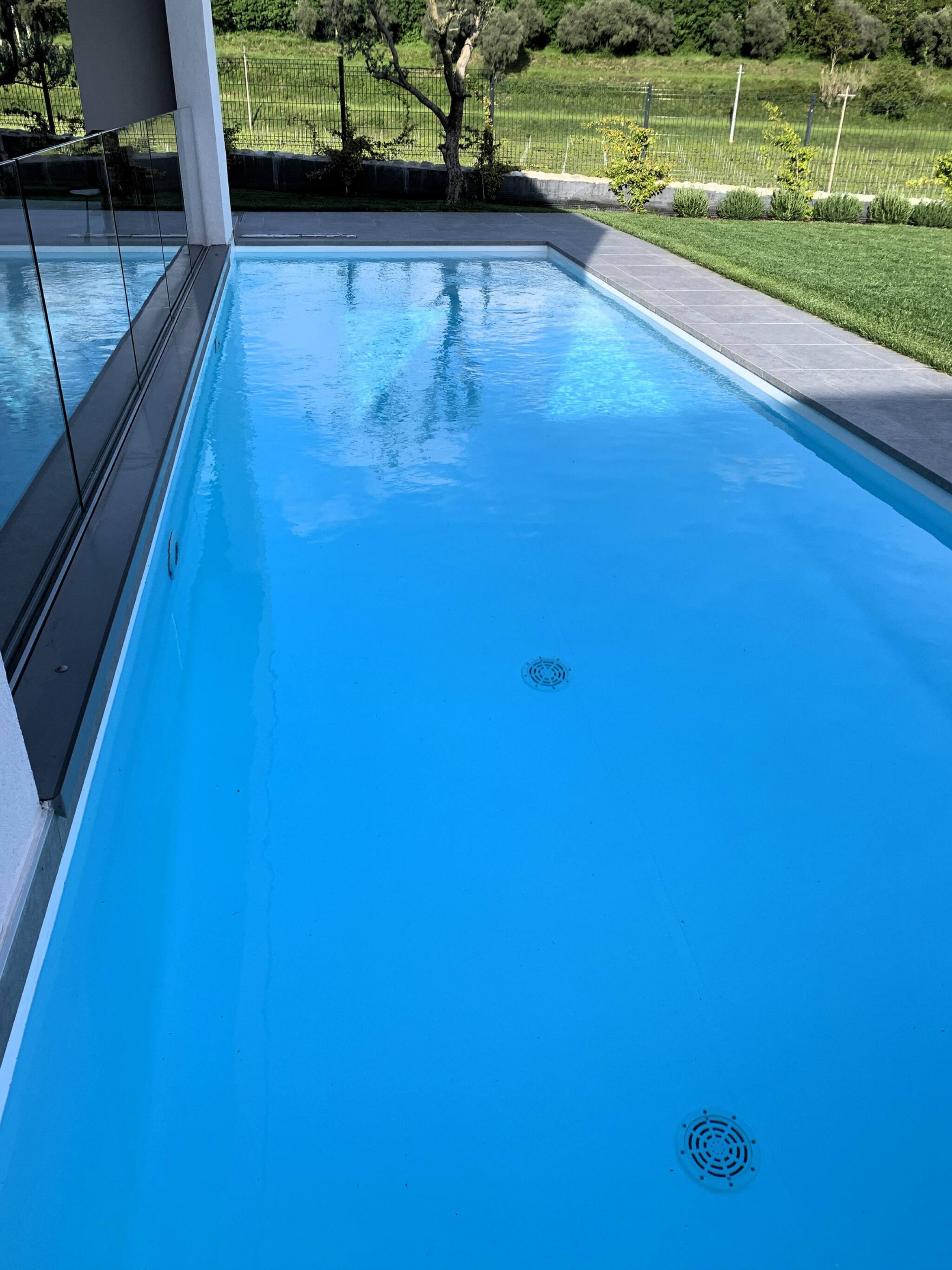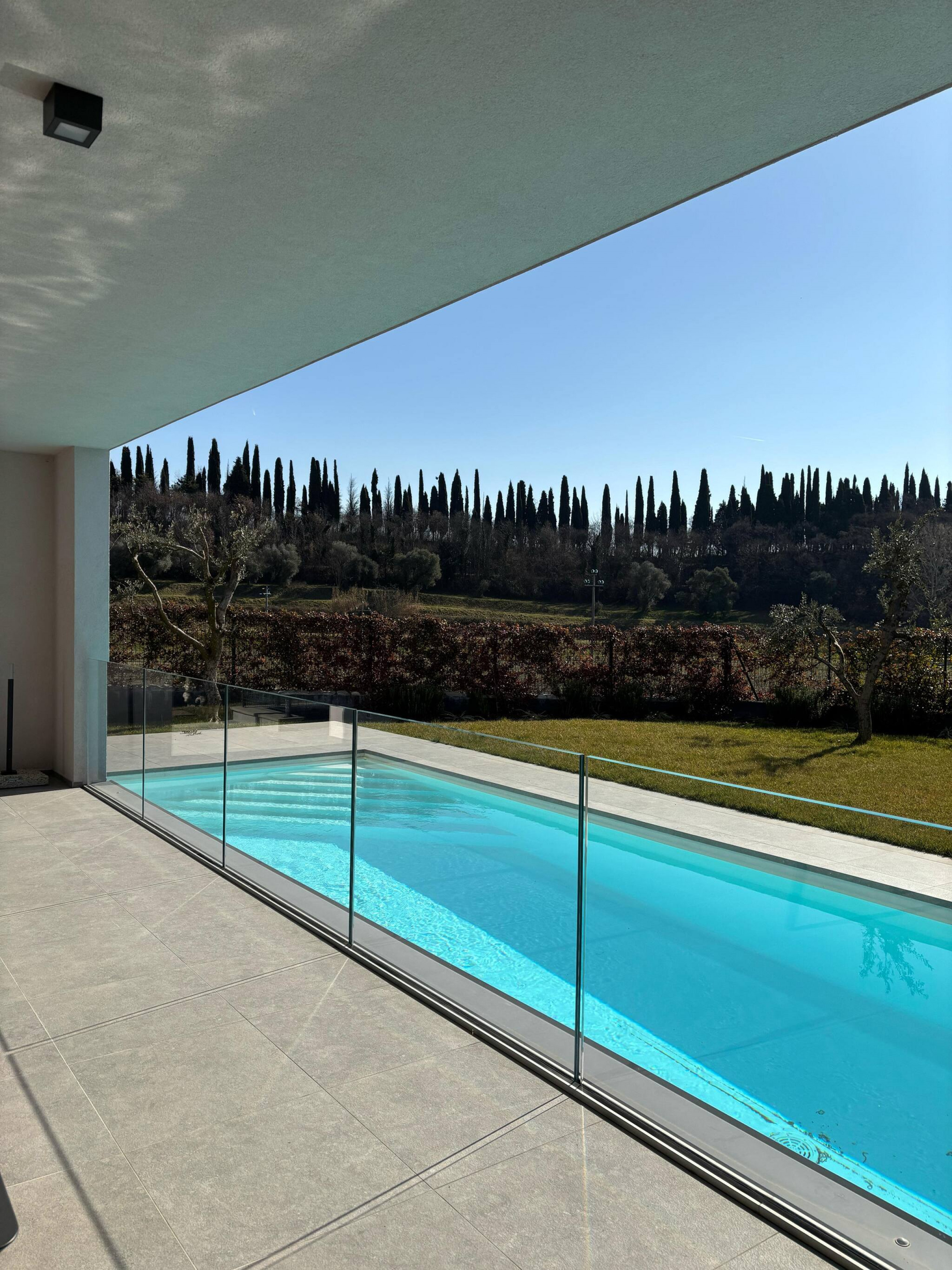 Der Eingang öffnet sich zum großen Wohnbereich, der Küche und Wohnzimmer beherbergt, mit einer wunderschönen Glasfront mit Blick auf den privaten Pool, der im grünen Garten eingebettet ist.