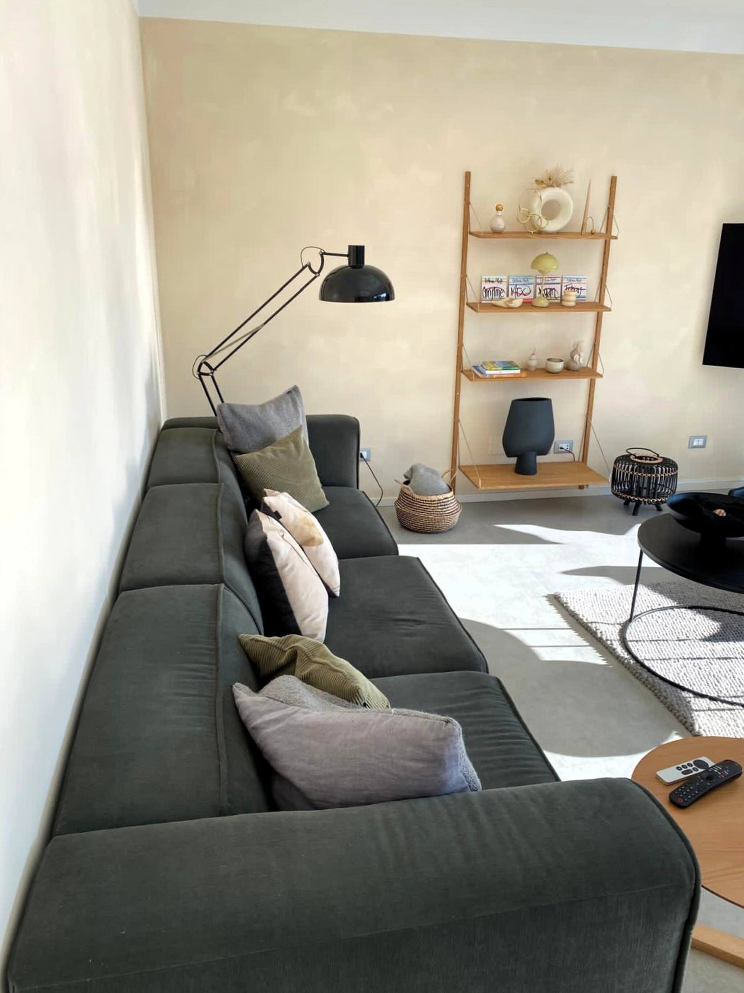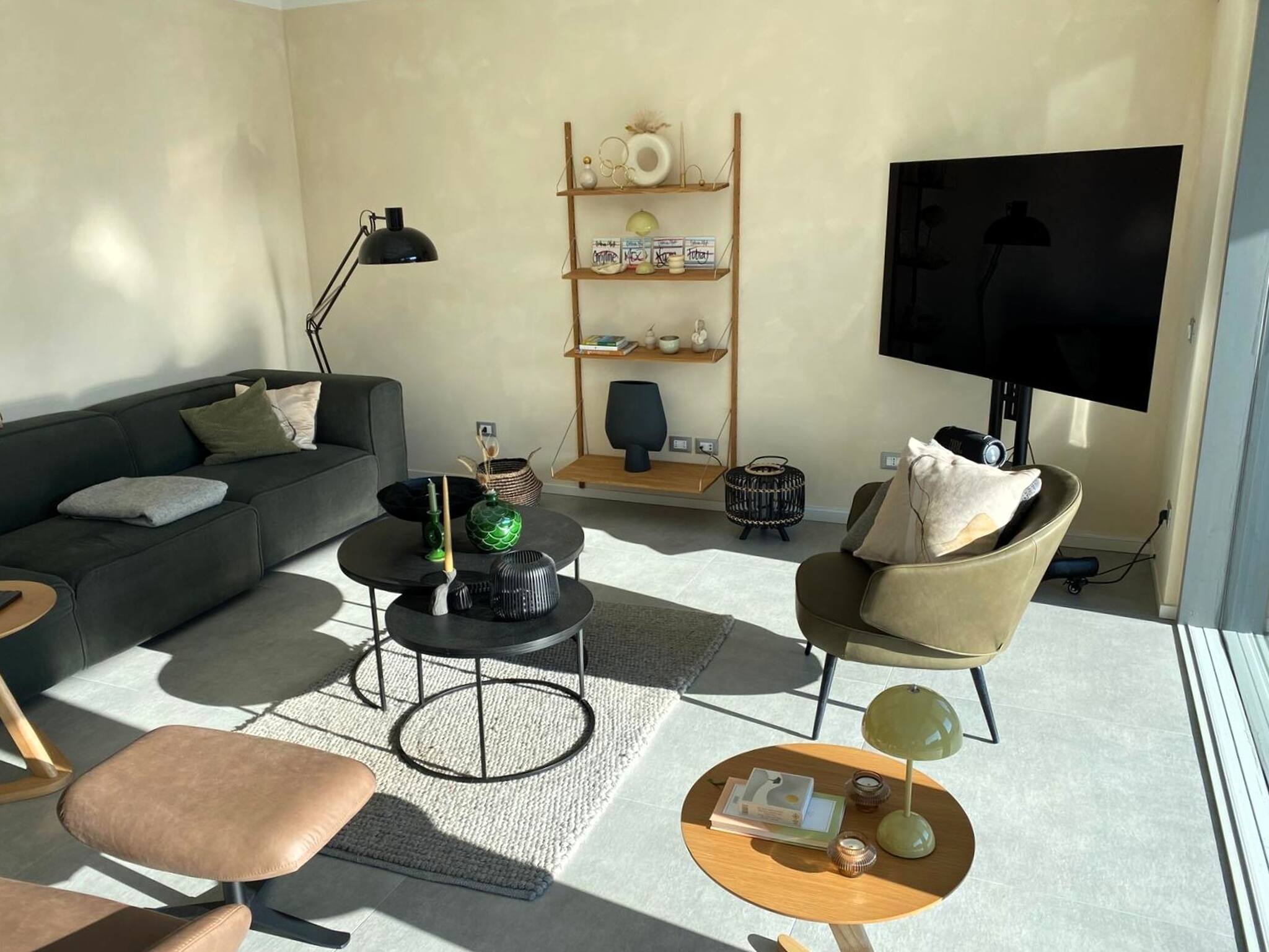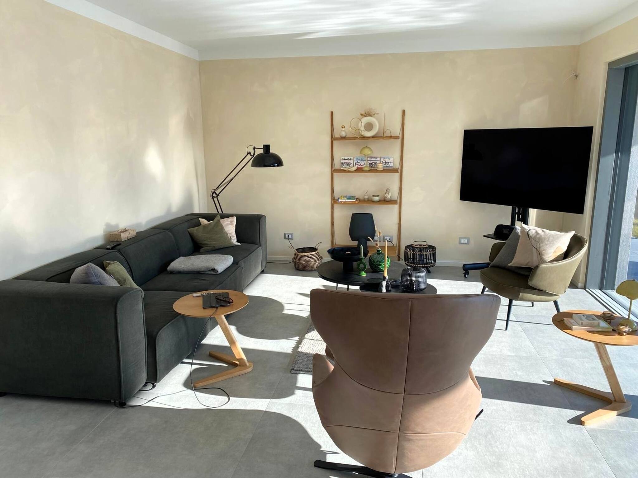 Der Eingang öffnet sich zum großen Wohnbereich, der Küche und Wohnzimmer beherbergt, mit einer wunderschönen Glasfront mit Blick auf den privaten Pool, der im grünen Garten eingebettet ist.