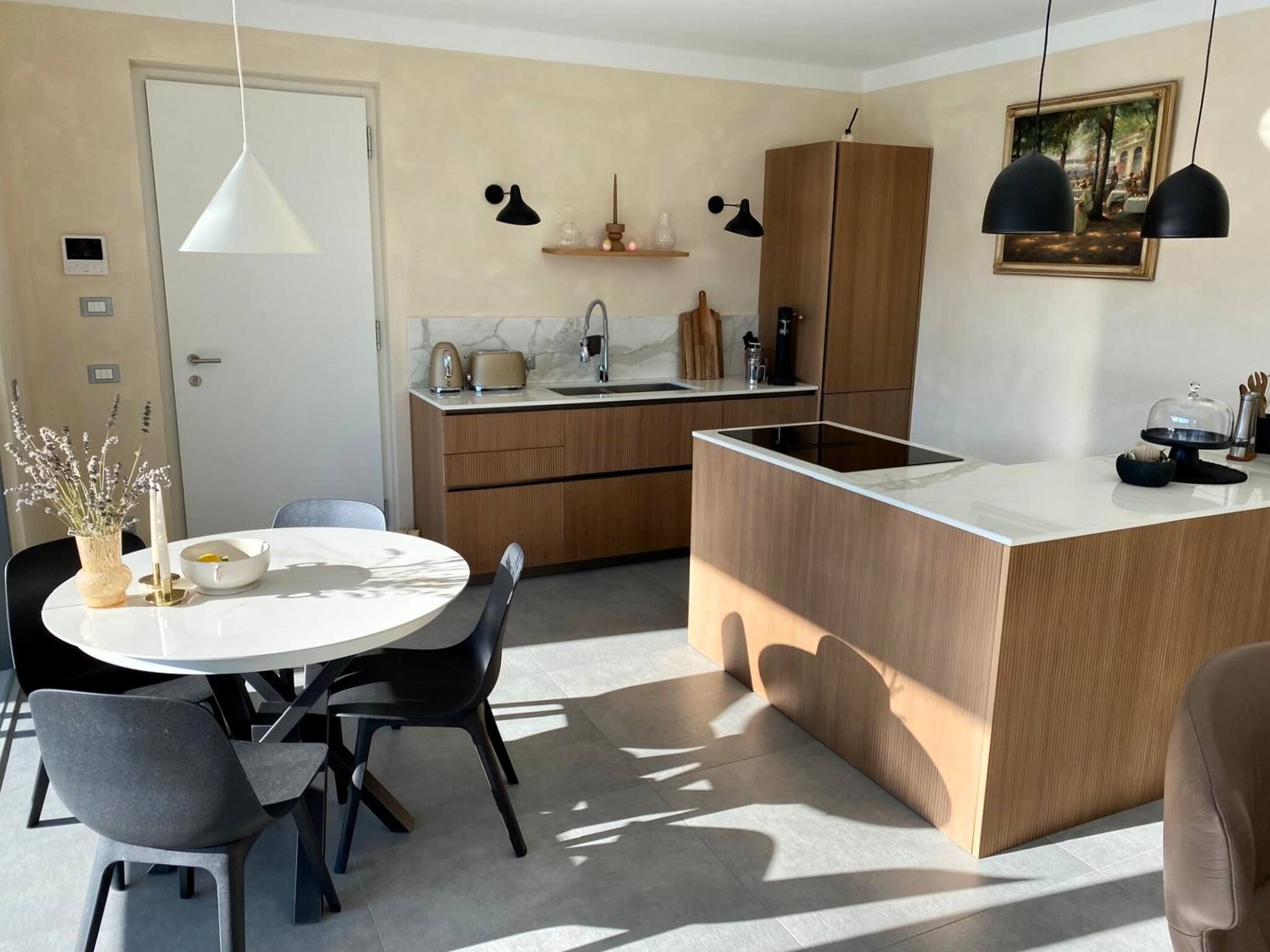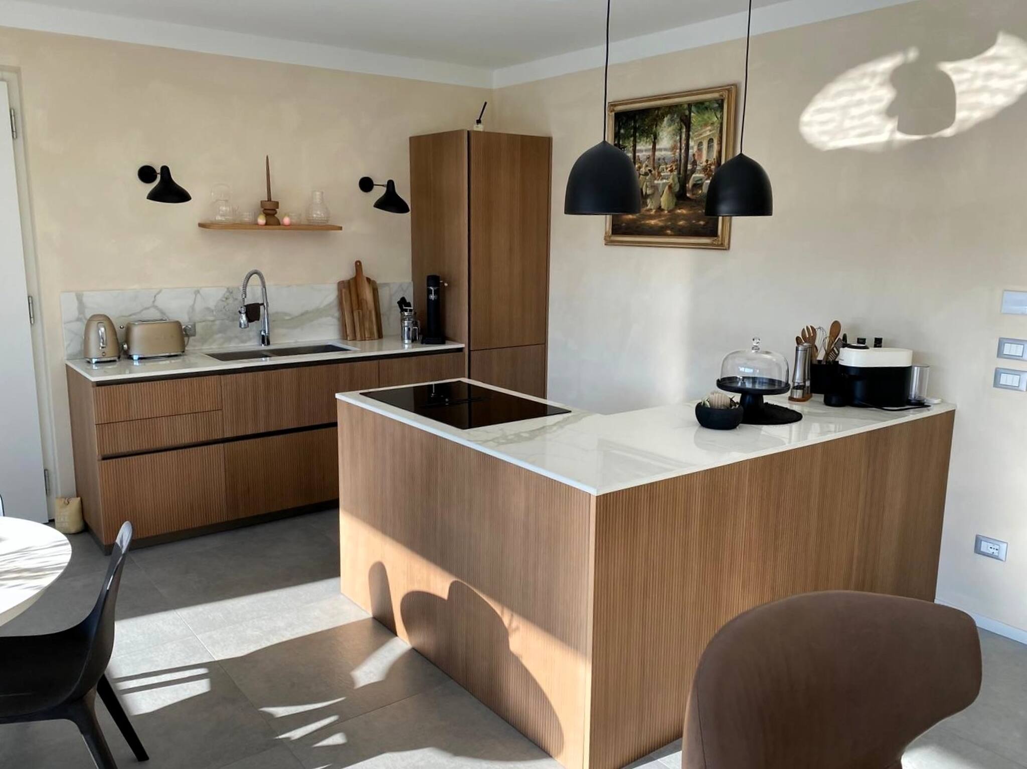 Vollständig ausgestattete Küche, Induktionskochfeld mit integrierter Haube, Doppelspüle, Geschirrspüler, Ofen, Kühl-/Gefrierkombination.
