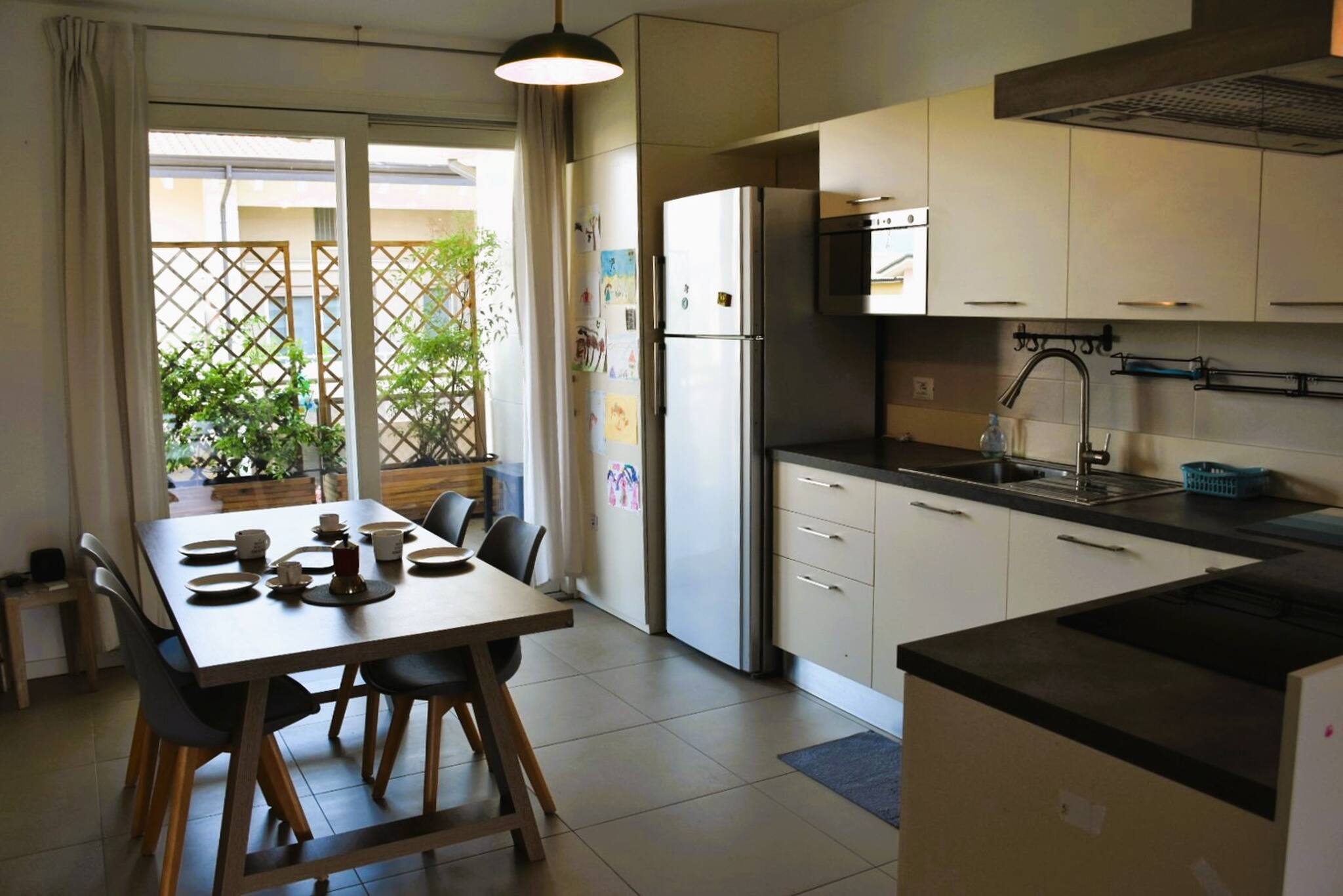 In the induction open plan kitchen, refrigerator, microwave, oven, dishwasher, dishes/cutlery, kitchen utensils, coffee machine, toaster and kettle are provided.