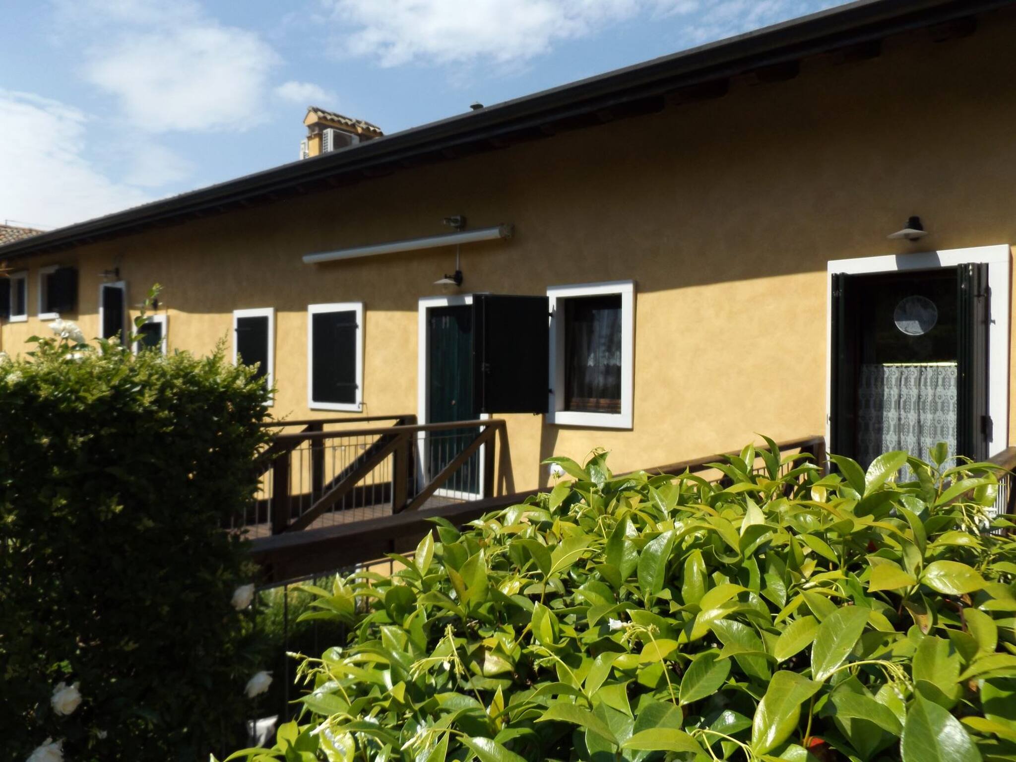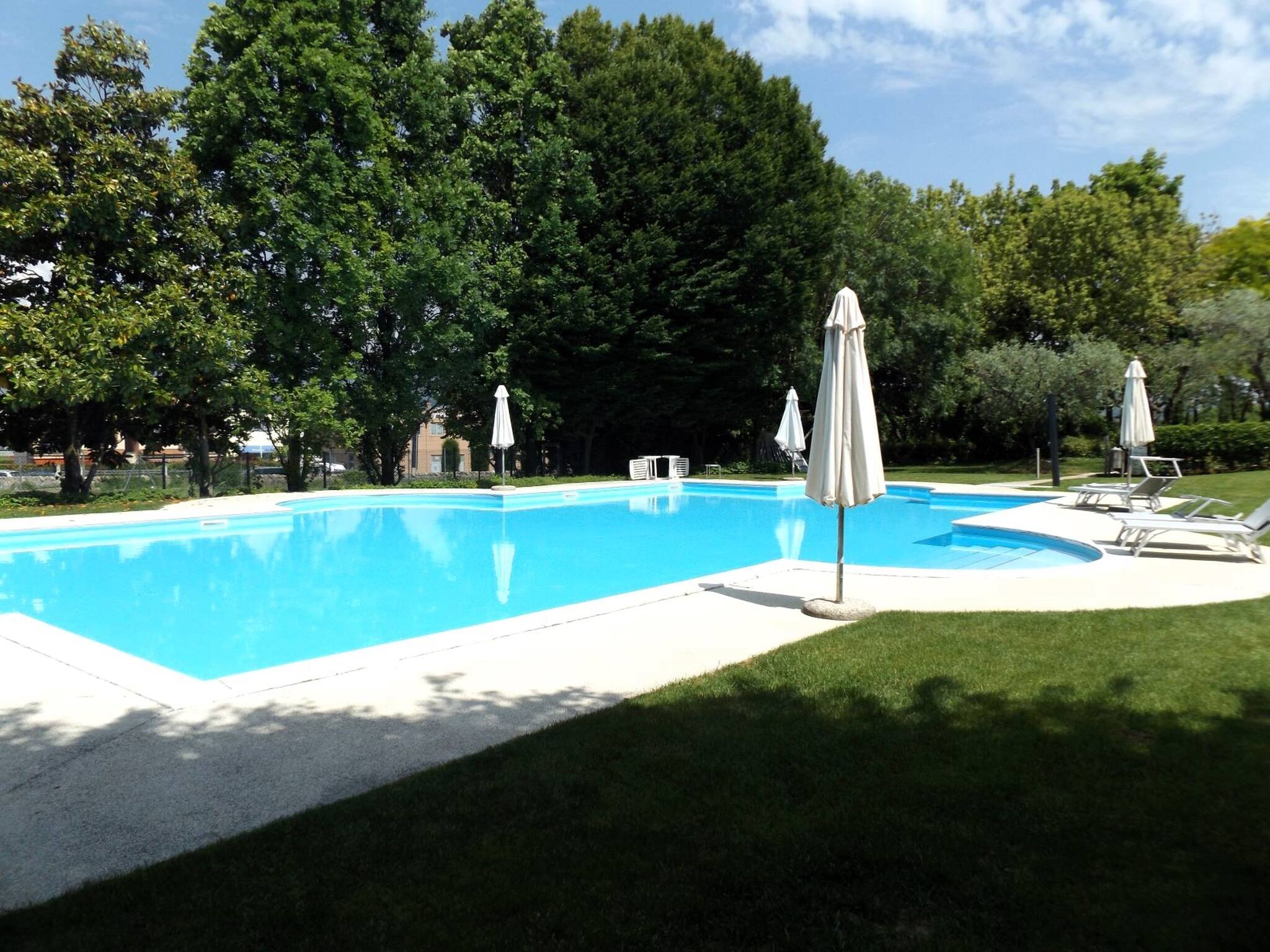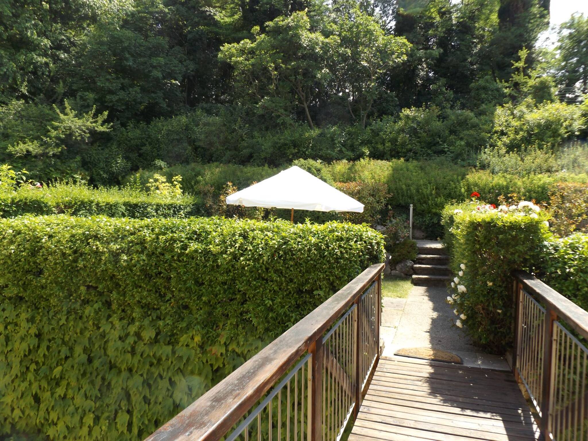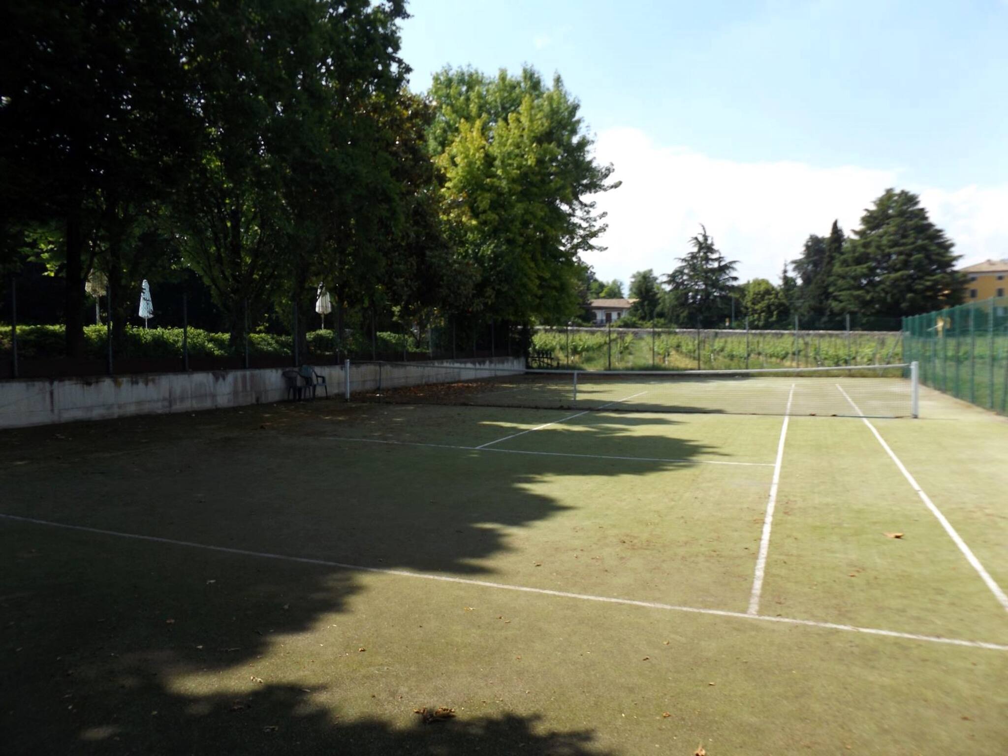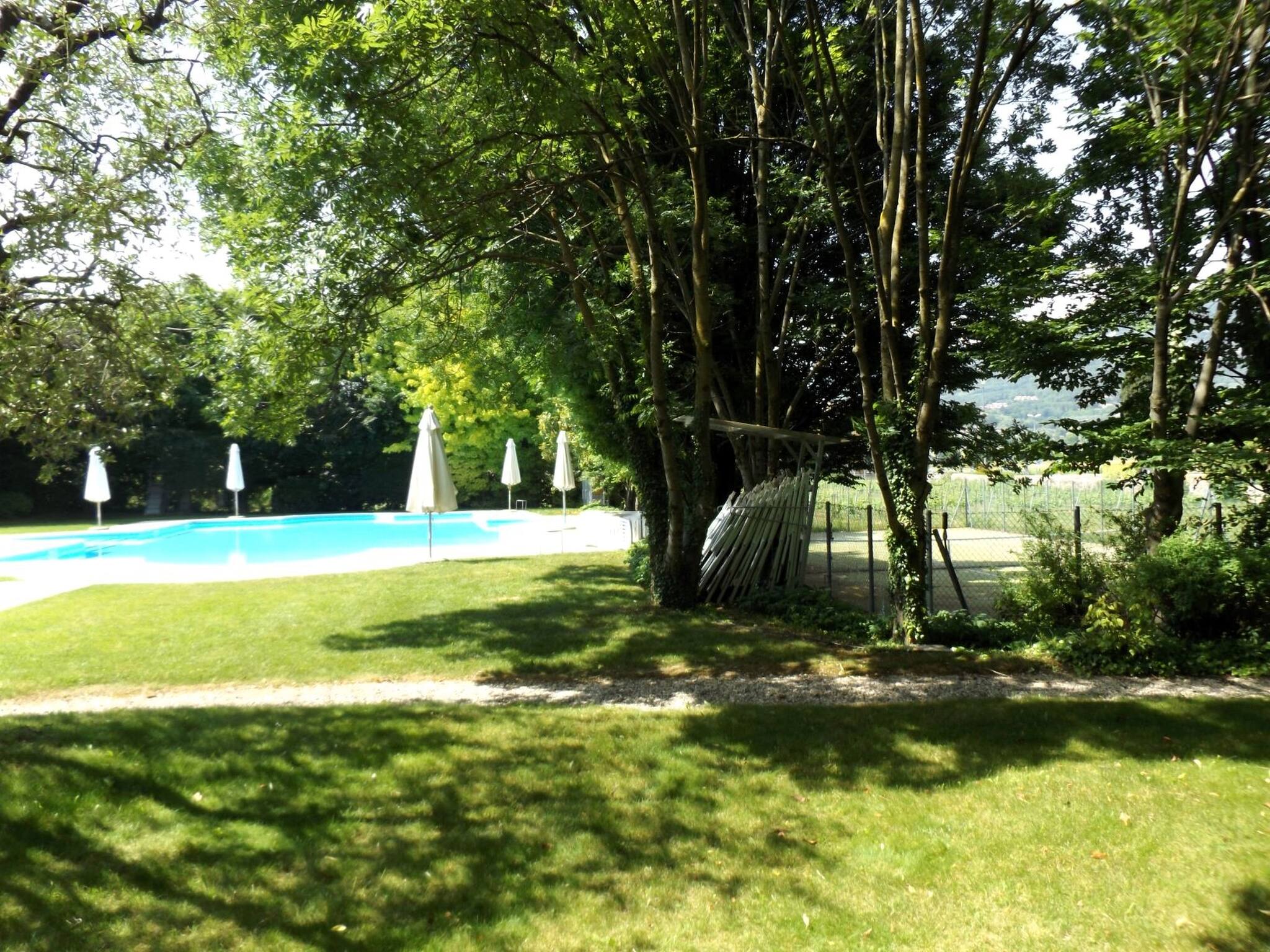 In a historic elegant farmhouse completely renovated, with a lush park of 6000 sq m, where there is a large swimming pool (approx. 18×10 m), a tennis court, gym and sauna, there is the mezzanine two-room apartment, in a quiet position and with its own small private garden, where a table, chairs and parasol can be placed. A few metres away, you can directly access, through a small gate, the cycle path and many walks, many of which are panoramic and lead to the lake. The accommodation is on the ground floor with an independent entrance; small private garden with table, parasol and chairs. To access the apartment, you cross a small wooden bridge. Open-plan entrance and kitchen (Verona red marble hob. 4 burners, electric oven, microwave, fridge-freezer, dishwasher), living area with table and chairs, TV and direct access to the garden; bedroom with French bed 140 cm, bathroom with shower and washing machine; you have to climb 13 steps to the mezzanine above the living room (wooden floor), where the second double bedroom is located with dormer/velux and small windows; bathroom with windowed shower. Air conditioning. Private garage. Pets accepted; 2 sunbeds and condominium parasols in the pool are available for each apartment.