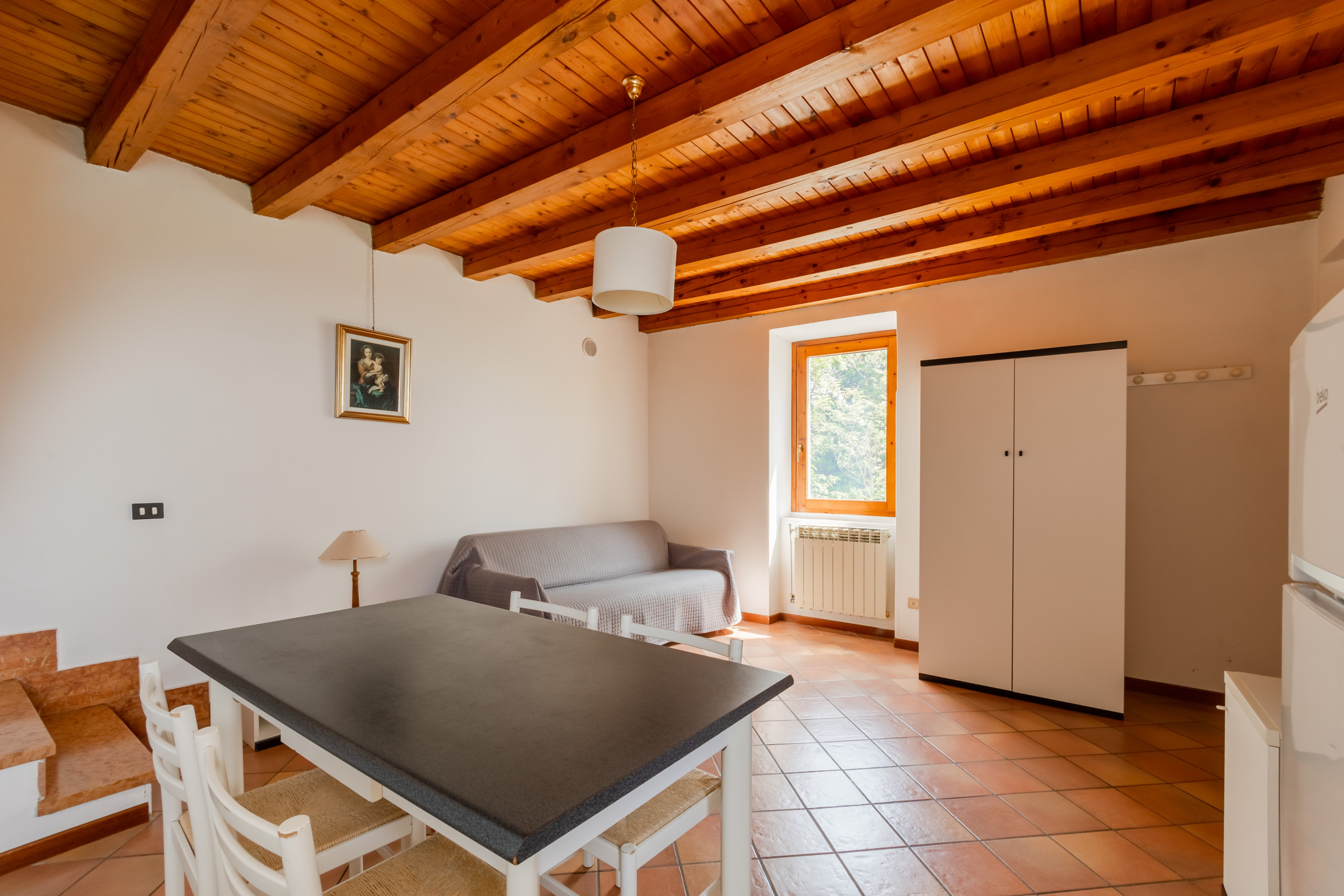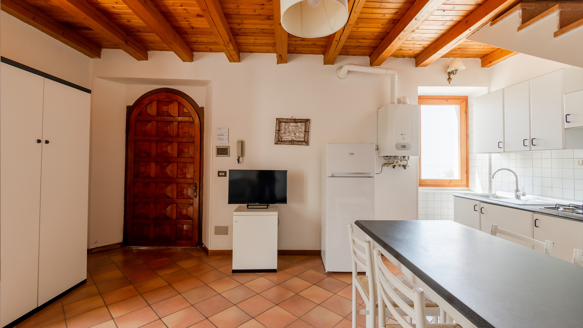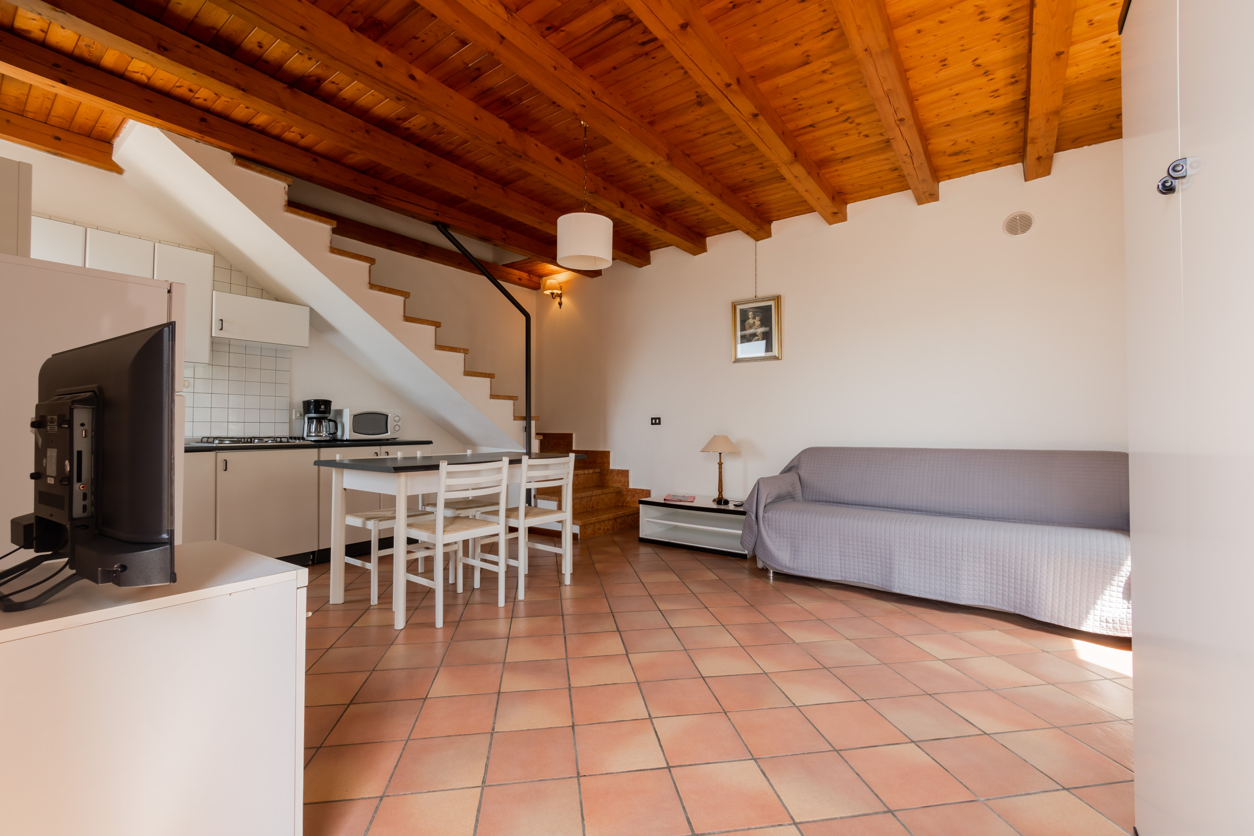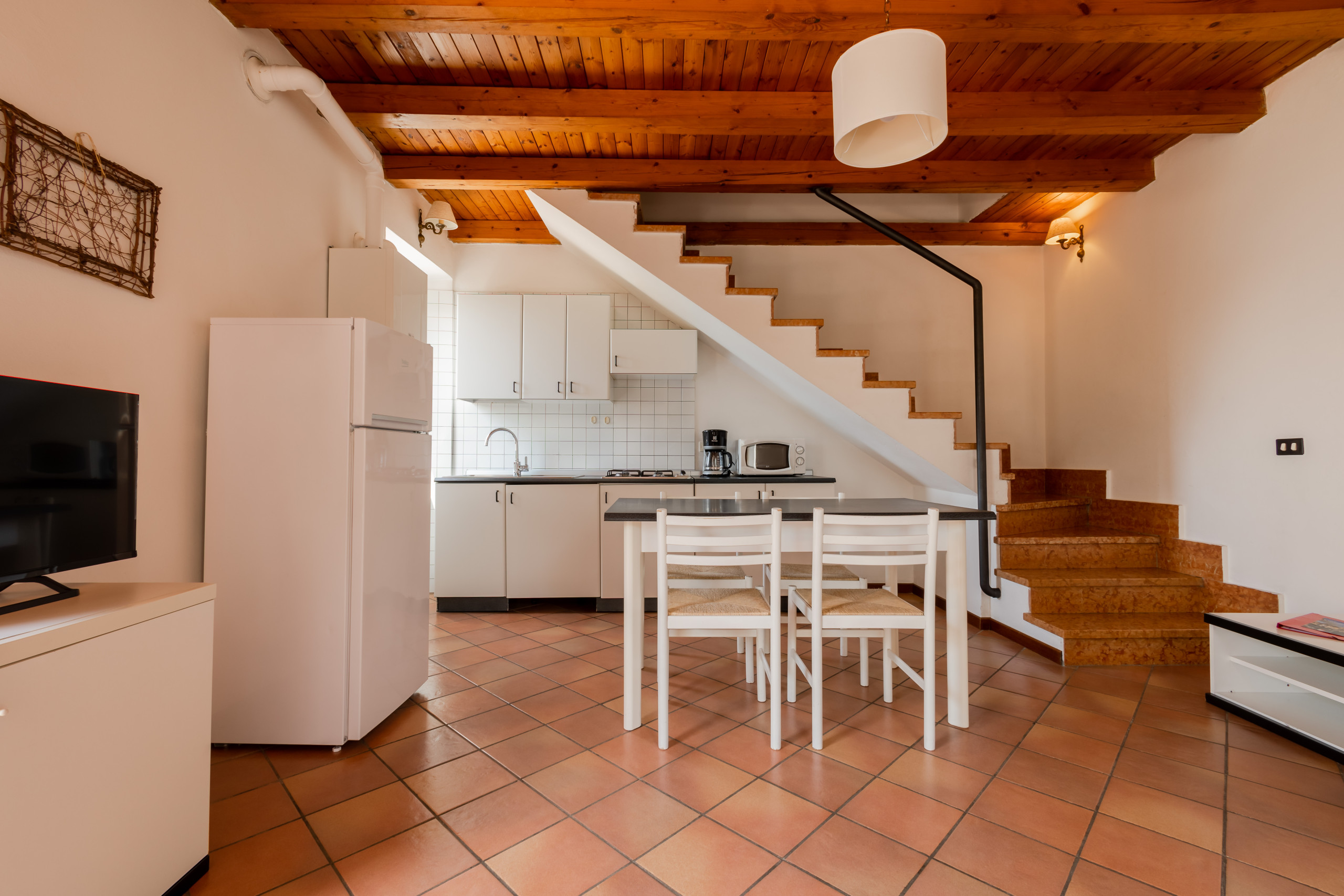 Apartment 01 is located on the first floor and is distributed over two levels.
