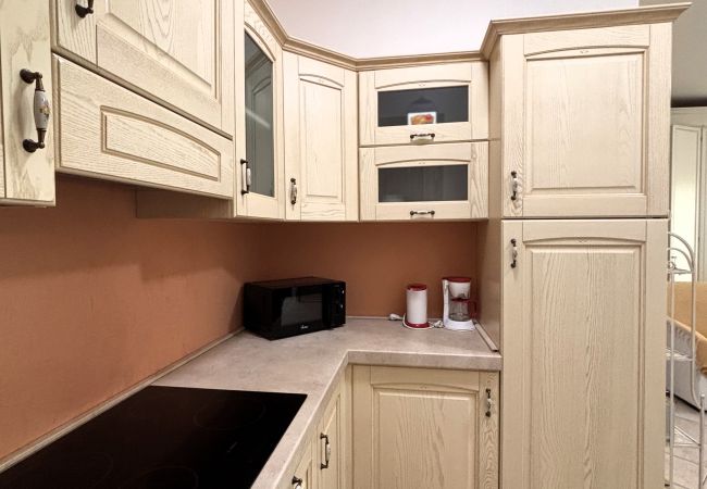 The apartment spans 50 square metres and features a spacious bedroom with a double bed, and a comfortable sofa bed in the living room, ensuring comfortable rest. The accommodation includes a bathroom with a shower, ideal for refreshing after a day of excursions.