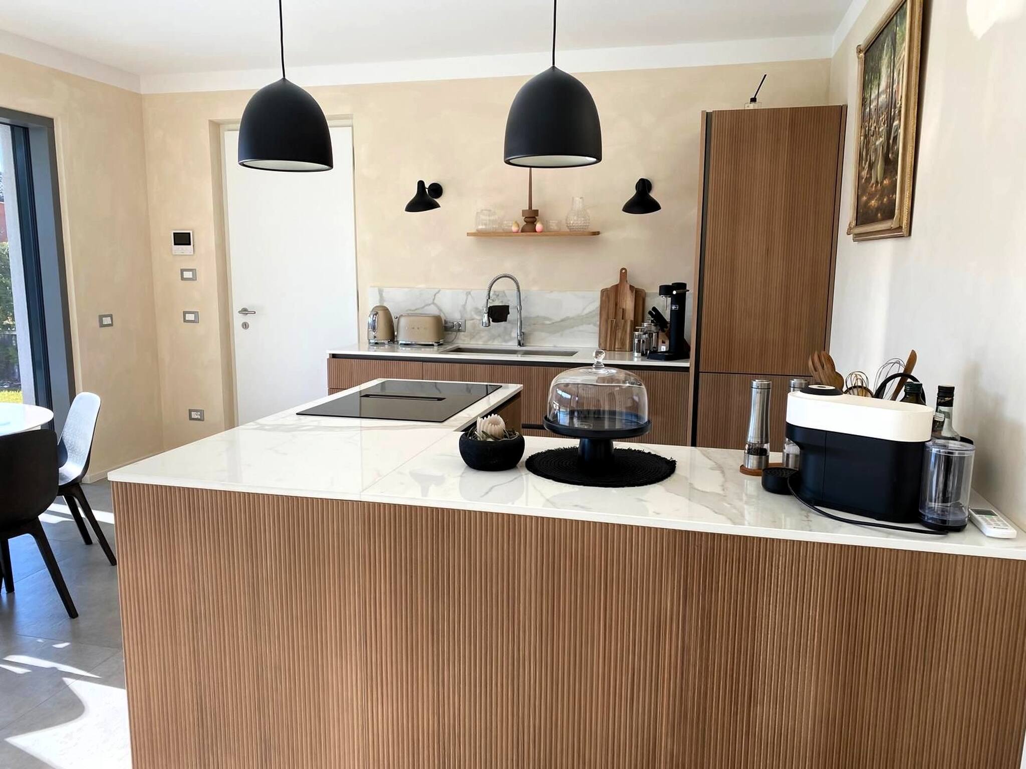 Fully equipped kitchen, induction hob with integrated hood, double sink, dishwasher, oven, refrigerator/freezer.
