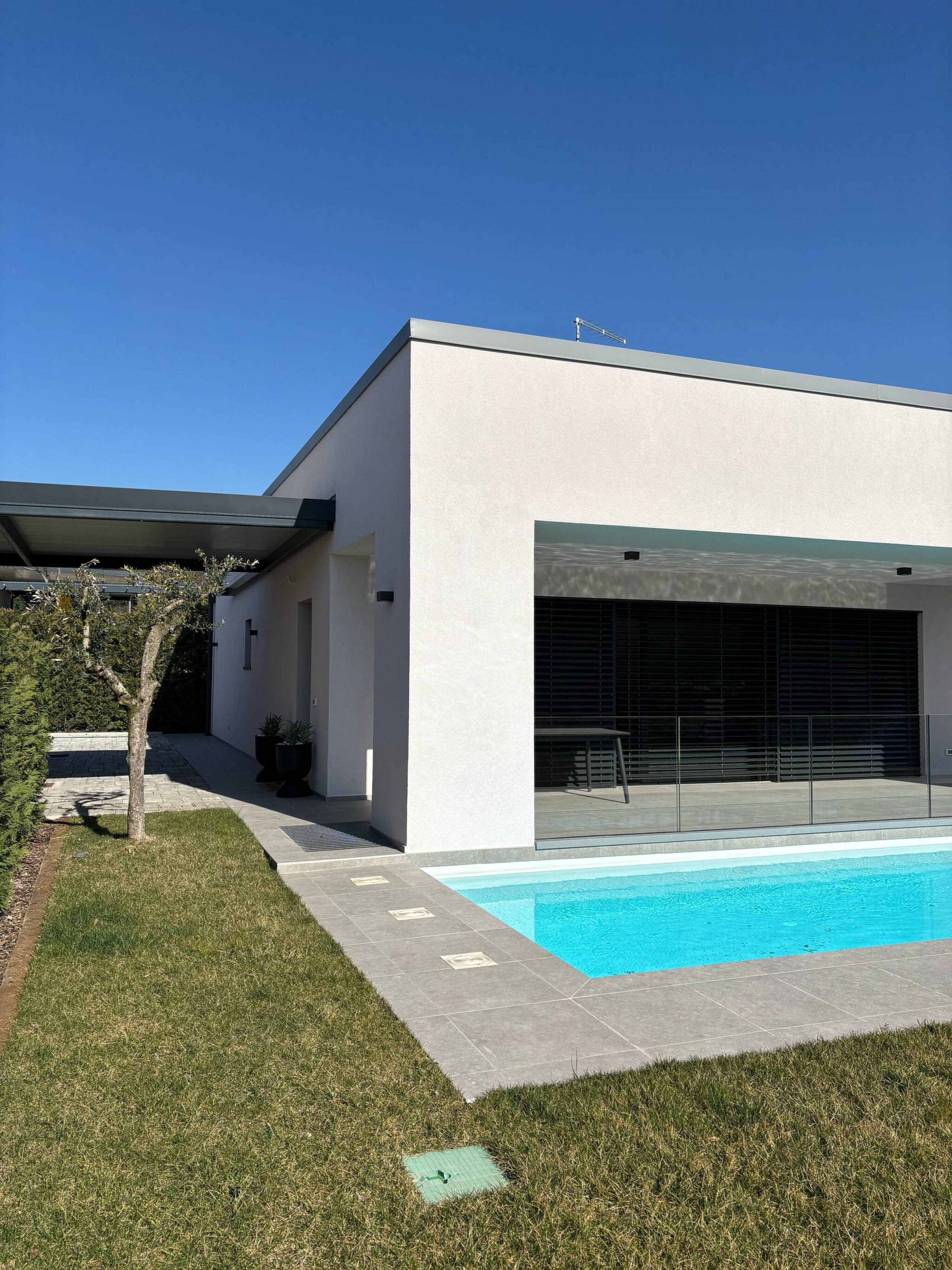 The entrance opens onto the large open space that houses the kitchen and living room, with a splendid glass wall overlooking the private pool immersed in the green garden.
