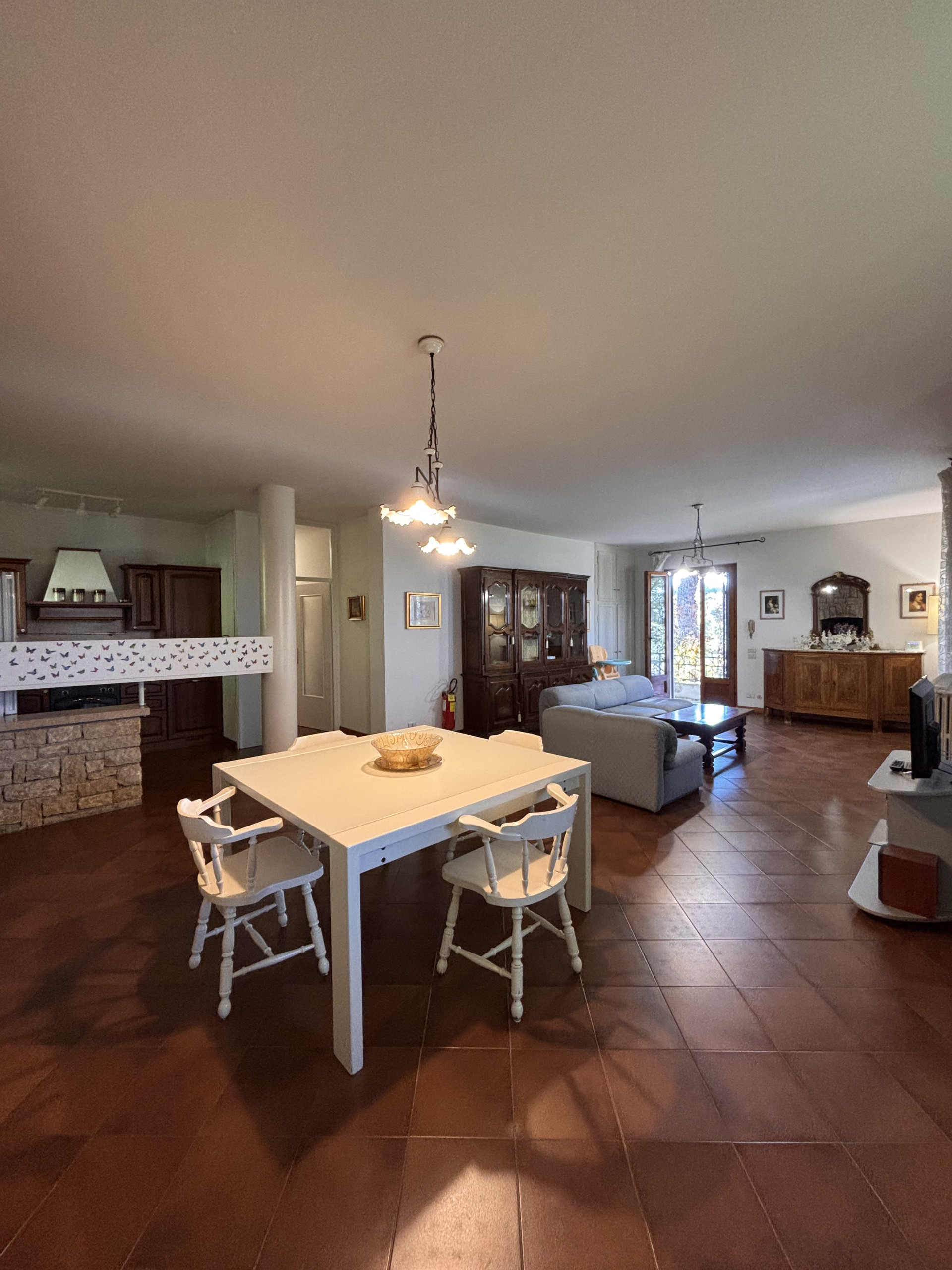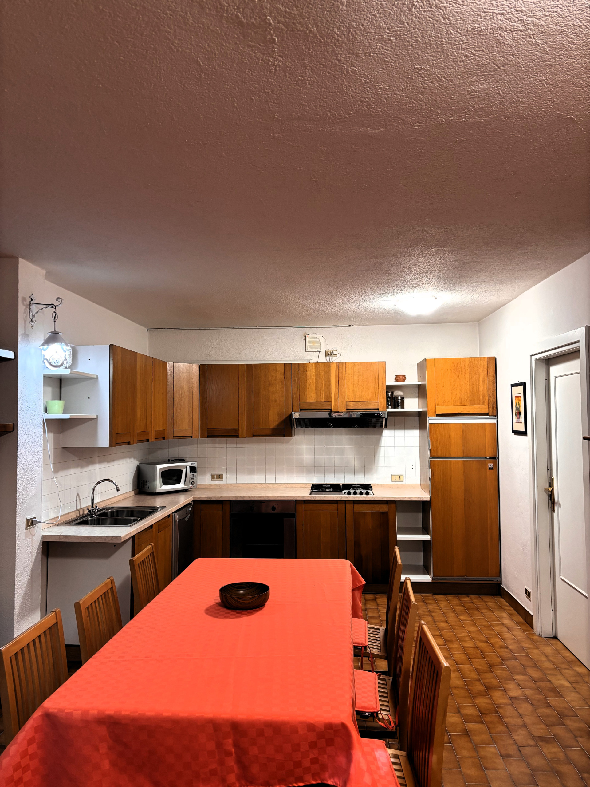 The kitchen is quite large and fully equipped with a dishwasher, oven and fridge with freezer compartment. From the kitchen, through a door, one accesses the dining room/living room with a fireplace, which is used as a dining area and an area with sofas, including a two-seater sofa bed, complete with hi-fi stereo and satellite TV.