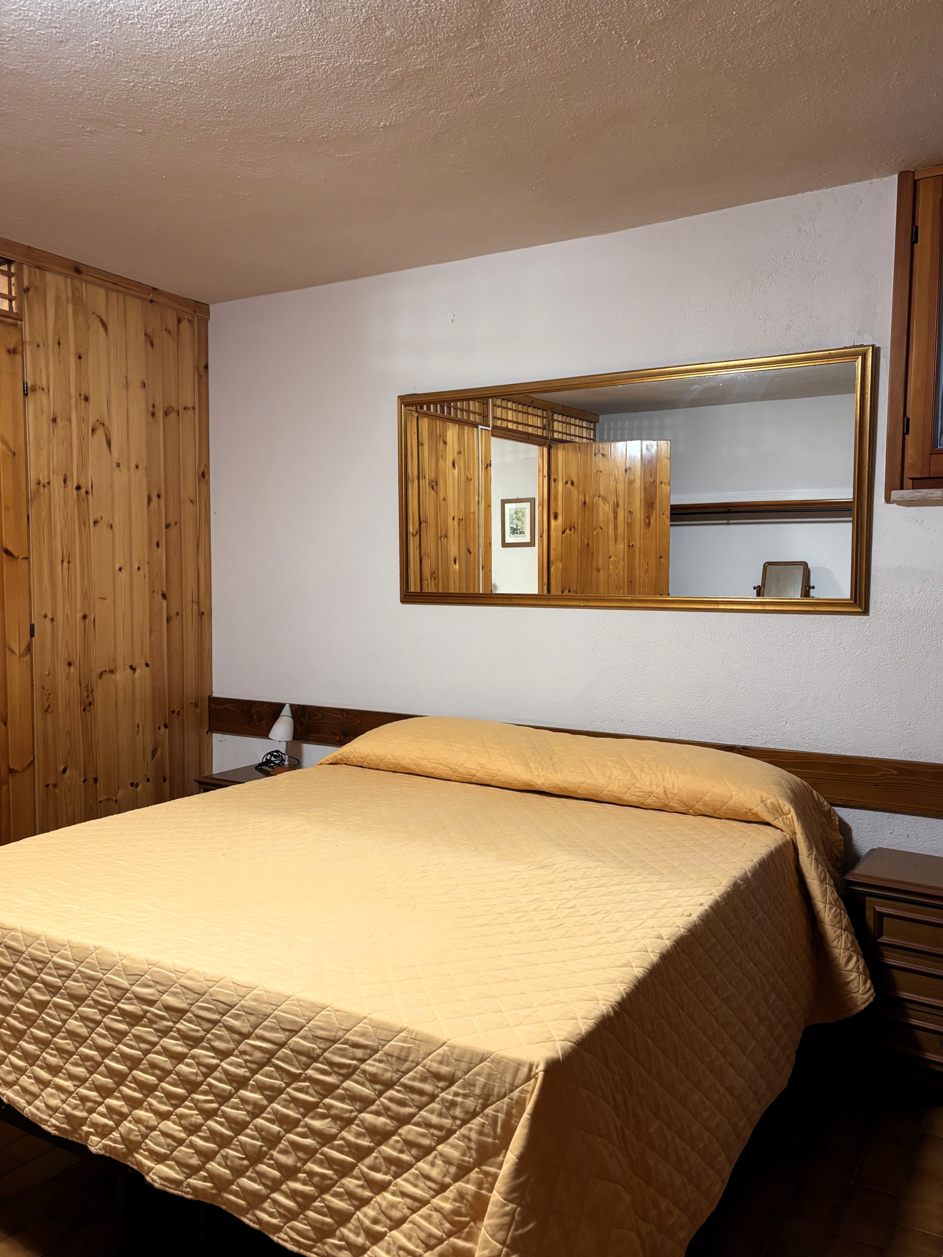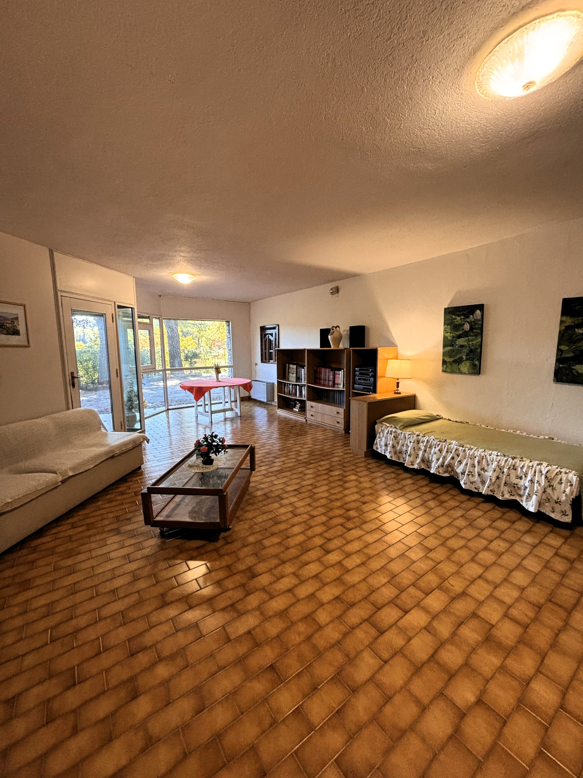 The living room and bedroom area are equipped with air conditioning. Both the kitchen and the living area have French doors that open onto the large front panoramic terrace. From both these rooms, through a corridor, one accesses the bedroom area, where there is the green double bedroom that shares a bathroom with a bathtub with the yellow double room (bunk beds), while the main double bedroom has a small private bathroom with a shower. The yellow room has direct access to the rear garden and pool level.