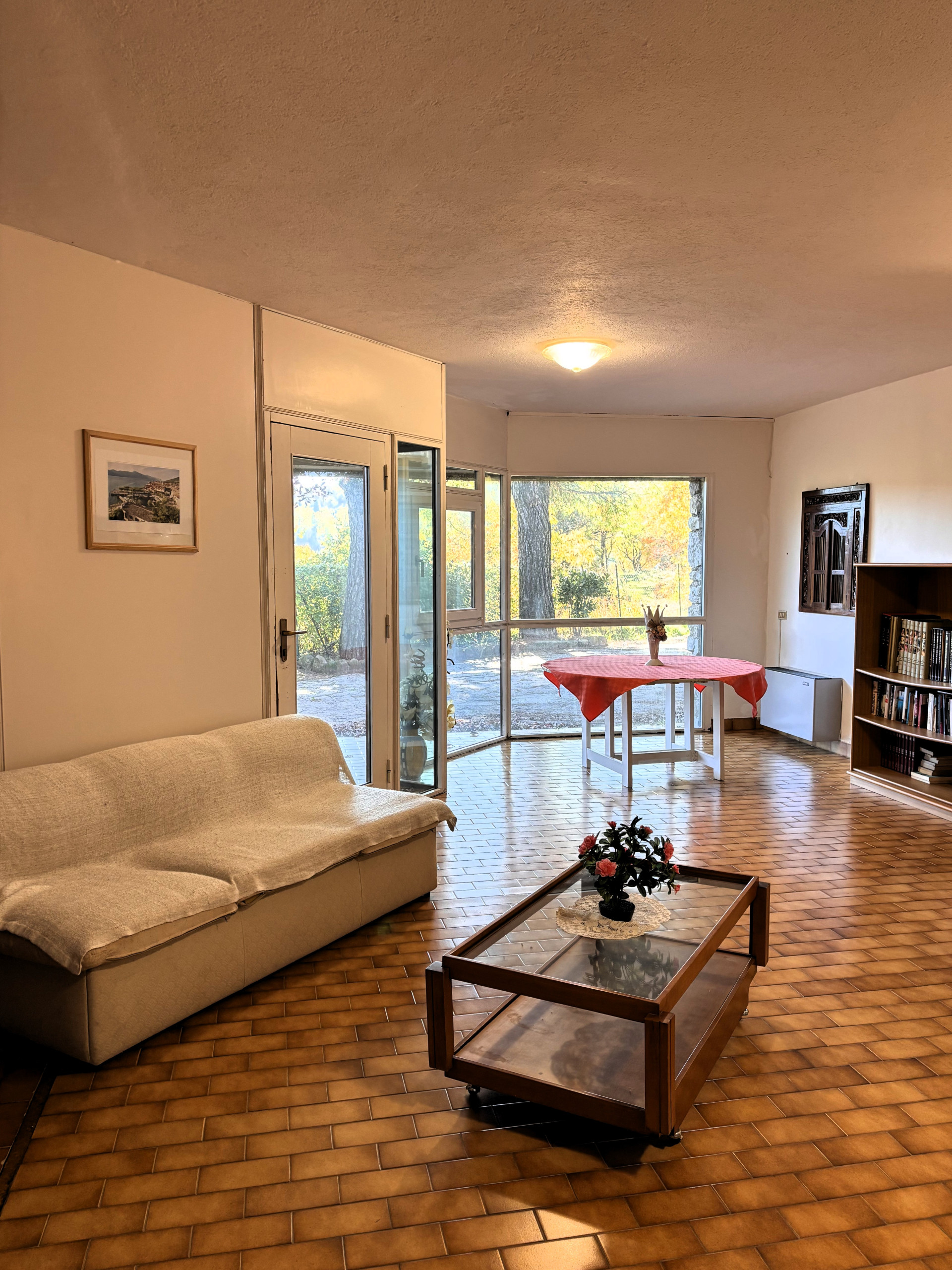 Access to the main floor of the house is via a staircase of 19 steps, which leads to a terrace of 12 x 3 metres, with a spectacular 180° view of the lake. The kitchen and living room/dining room doors open directly onto this terrace. Alternatively, from the garden level in front of the house, one can access the rear part (and pool level) of the house, where the bedrooms are located, by climbing a side garden pedestrian path.