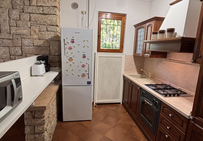 From the entrance and car park, a staircase leads to the main entrance, where there is a large living-dining room with kitchen and fireplace; a double bedroom, a twin bedroom and a single bedroom; two bathrooms (one with shower, the other with bath/shower). Access to the lower floor is through a spiral staircase: here there is another bathroom with shower, a living area (two single beds), another kitchen and a double bedroom. From this floor, direct access is provided to the car park and garden with a large and beautiful swimming pool. The villa's equipment includes mosquito nets on all windows, satellite TV and fans.